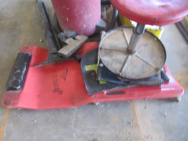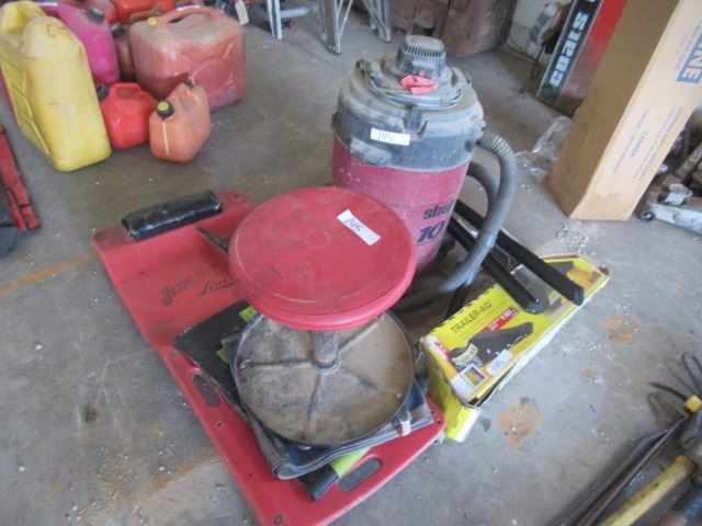 Shop Vac -10 Gal, Shop Stool on Castors, Poly Creeper, Trailer Tire Wedges, 2 New Double Squee Gees
