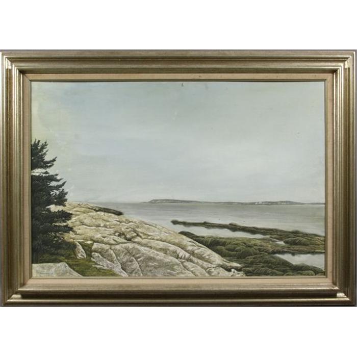 Shore scene, 1975, o/b, 24" x 36", 31" x 43", signed indistinctly and dated '75 LC. Good condition.