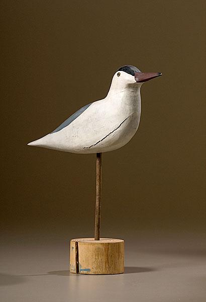 American, mid to late 20th century, wood with glass eyes and original paint, on a wooden stand; 14" long.