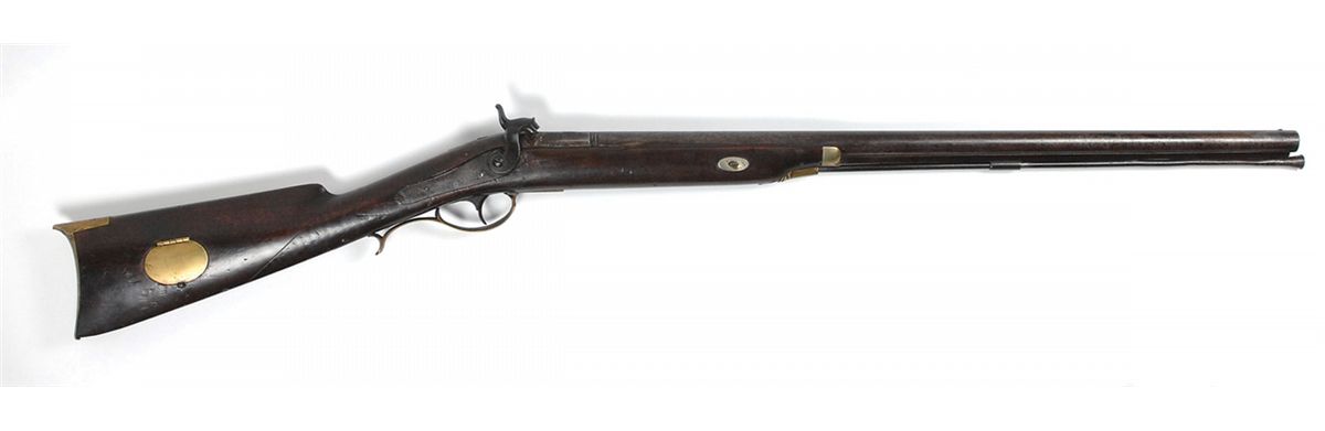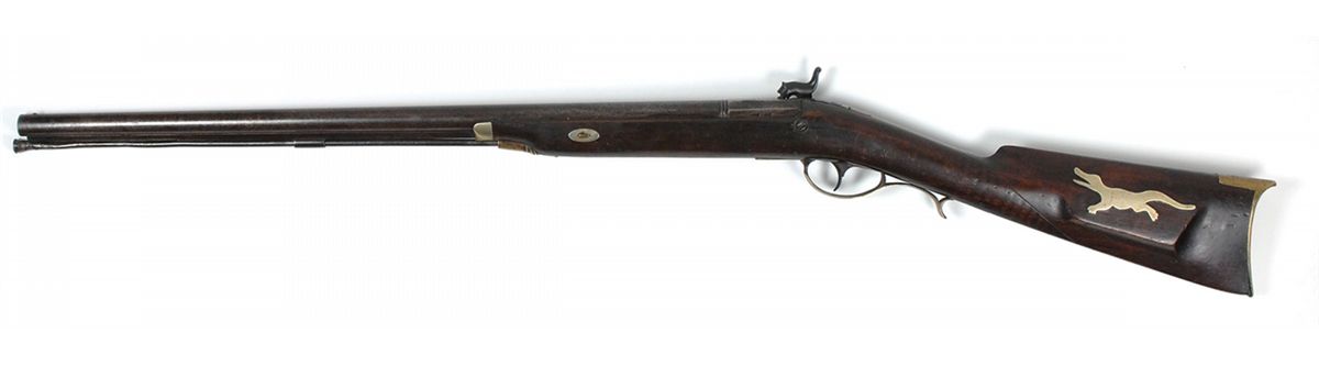 This is a light gun that is only 42? long with a .59 caliber 26? long round barrel with an octagonal breech. The barrel has a smooth bore and a steel under-rib that holds a steel ramrod. The back action lock is marked “Josh. Golcher/Warranted,” and has a little light engraving. The stock has a brass buttplate and trigger guard, and a small oval brass patchbox. There is a very unusual large nickel silver inlay of an alligator in the cheekpiece—perhaps the original owner was from down south, and this would be a handy size to use in a boat. The wrist has very worn English-style checkering. All of the iron has a dark patina with light pitting on the breech near the nipple. The lock works, and the lettering is very good. The stock has some filler behind the top tang and under the nipple with a grain crack at the lock screw. The wood retains most of an old refinish. This is a good looking little gun.