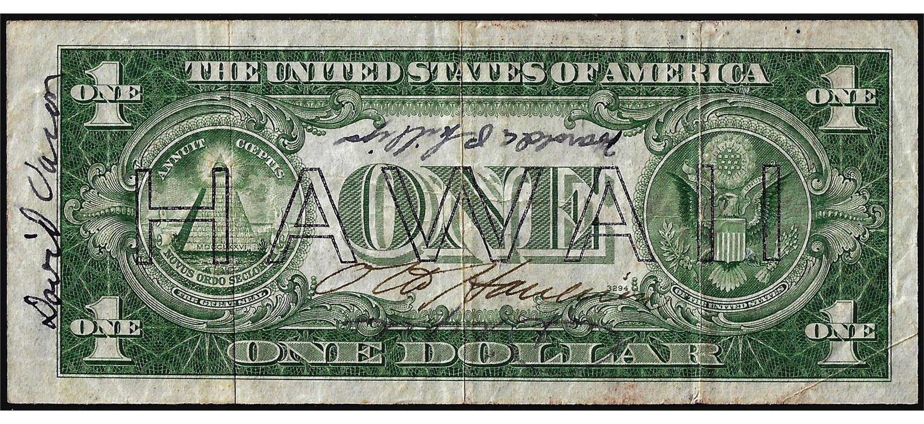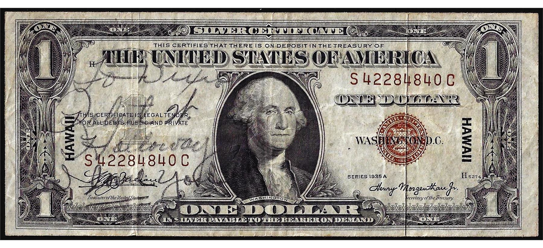 One Short Snorter Signed 1935A $1 Hawaii WWII Emergency Silver Certificate Note.