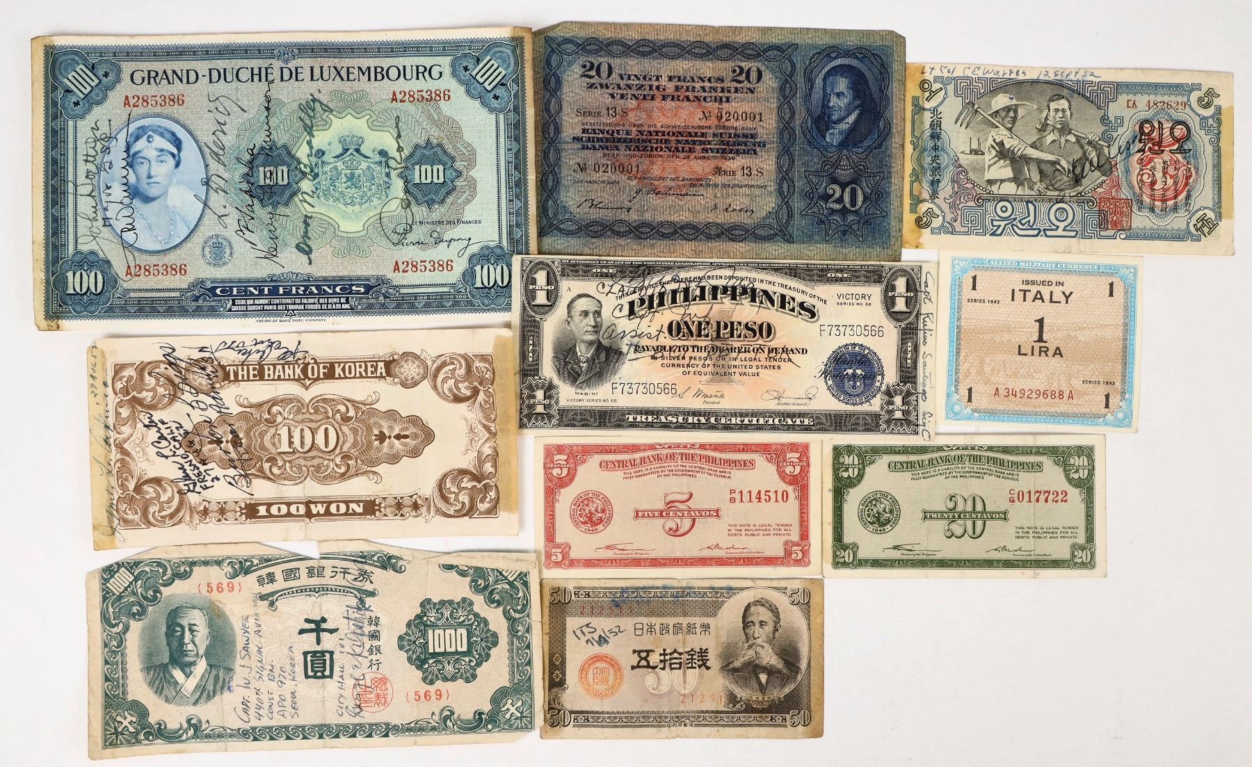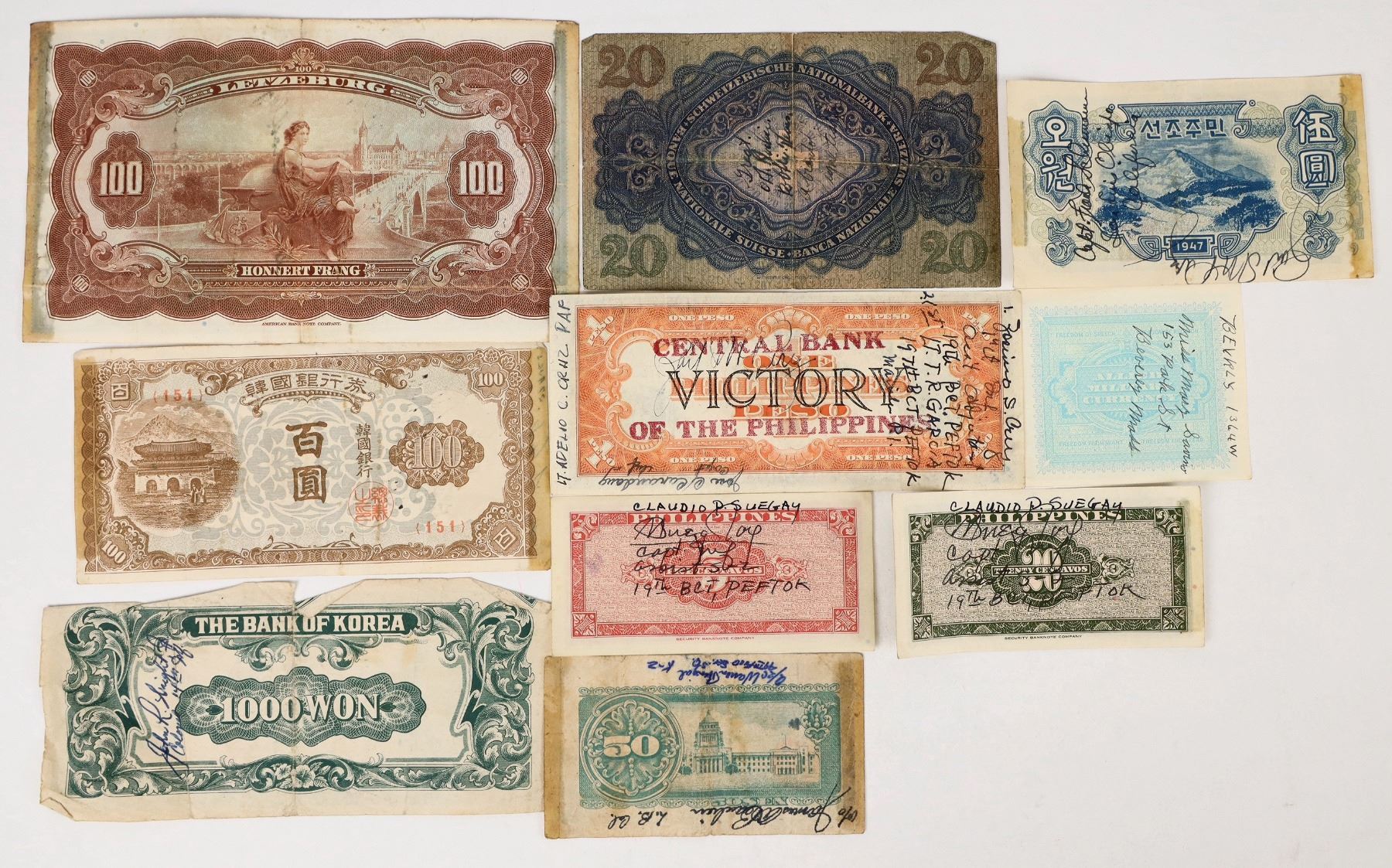 Collection of foreign currency signed by military members: Korea, Switzerland, Italy, Philippines, Luxembourg, Military Payment Certificates.