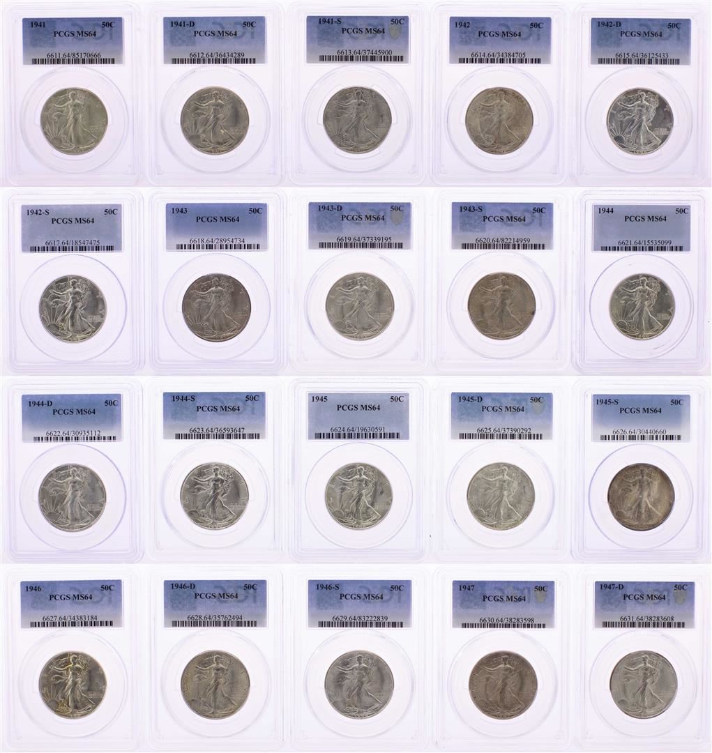 One Short Walker Set of 1941-1947 Walking Liberty Half Dollar Coins PCGS MS64. PCGS Graded.