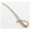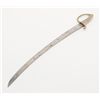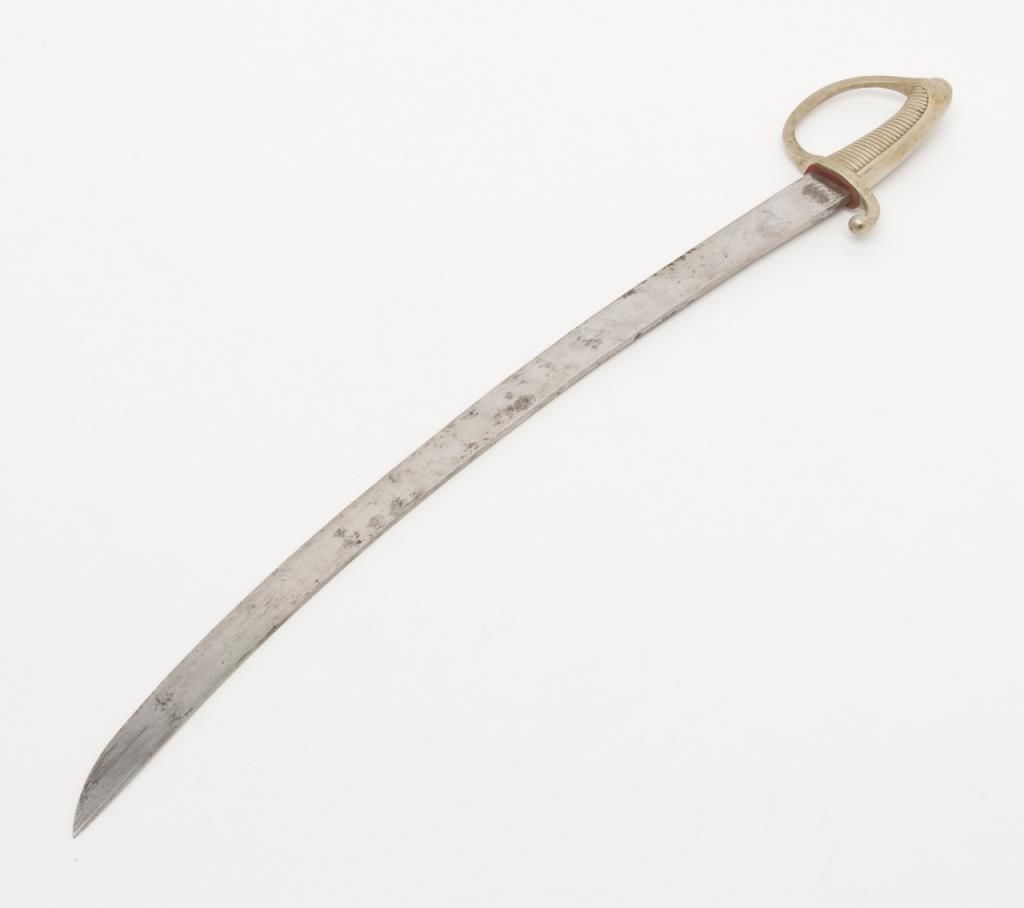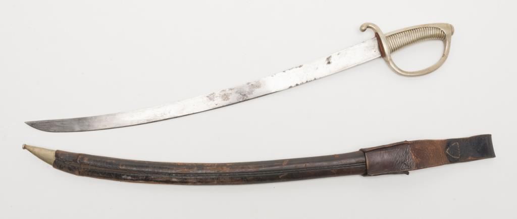 Short sword with cast brass integral guard/grip, un-marked blade in overall good condition with scattered spots of erosion; accompanied by leather covered scabbard with leather hanger; some scuffing, minor losses and some separation ofstitching. Est.: $400-$800.