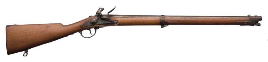 Shortened flintlock musket, .70 caliber, 27” barrel, two barrel bands and full length wood stock; no visible markings on lock plate; in overall good “out-of-the-attic” condition showing a heavy brown patina on metal surfaces, good action and good wood. Est.: $800-$1,600.