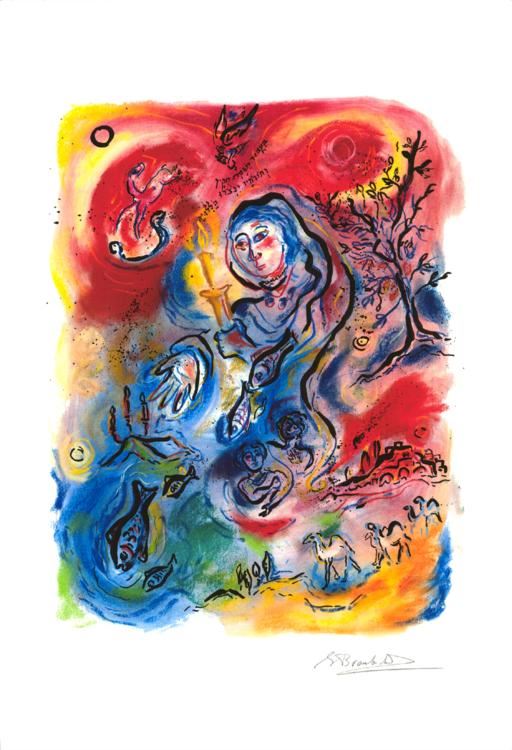 Artist: Shoshannah BrombacherTitle: BilhaMedium: GicleeSignature: Signed by artist, lower rightEdition: Artist ProofSize: 19" x 13"Condition: ExcellentBiographyShoshannah Brombacher Ph.D. is an writer, artist and maggidah from Amsterdam (Holland, 1959). She taught and studied medieval Hebrew literature in Berlin and Israel and currently lives in Brooklyn with her family. Her art is inspired by the teachings of the Chassidic Masters, which fascinated her since she found them long ago in her father's study. Her paintings are a tribute to the Chassidic way of life and service of HaShem (the Creator) . These Chasidic tales spread light in a dark world and enrich our hearts and minds, connecting us with HaShem. Brombacher views her art as a medium to do mitzvoth (commandments).My identity is as a "cholent" - a mix of Judaism, art, music, family life, literature - not necessarily in this order. According to the Breslover Rebbe, the task you are occupied with at a certain moment is for you the most important thing to be occupied with. I take that seriously, whether it is peeling potatoes or setting up a sketch. In the end it is all connected. *Retrieved from: http://womenofthebook.org/artists/shoshana-brombacher/