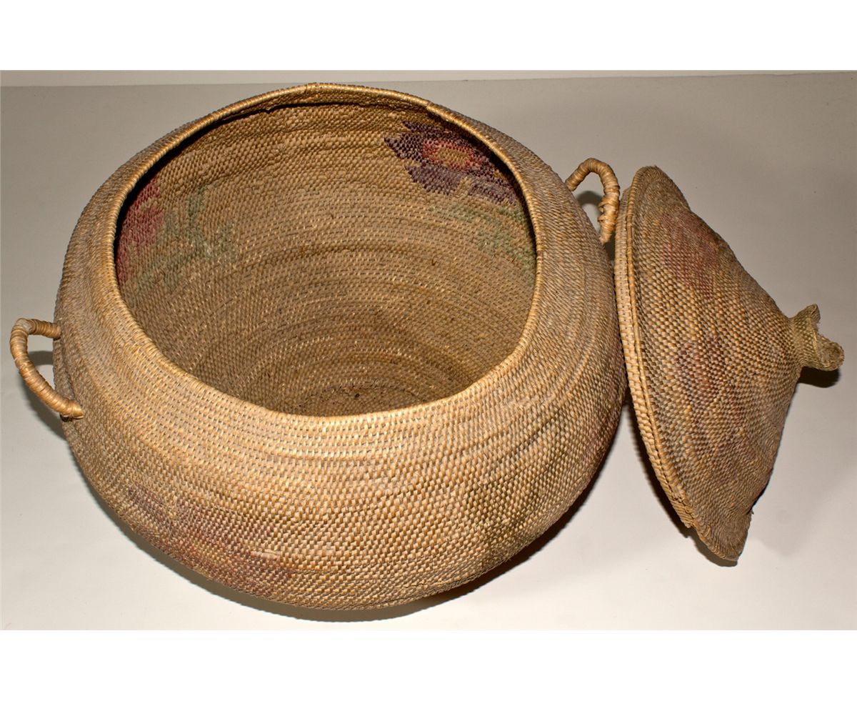 This is a very good size Shoshone basket with lid. Basket measures about 16" in height, is about 24" at its widest point and has a 14" opening at the mouth. The woven lid is about 17" across and about 6" high. The weave is tight, but there is some damage to the edge of the lid and on the handle. There is also unraveling on both handles. While the painted designs are absent from the outside, they are still visible from the inside.