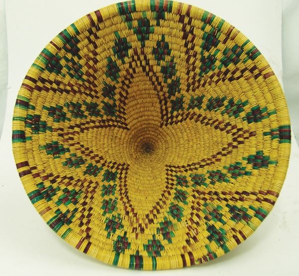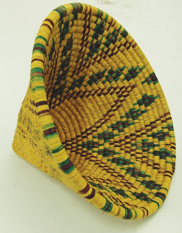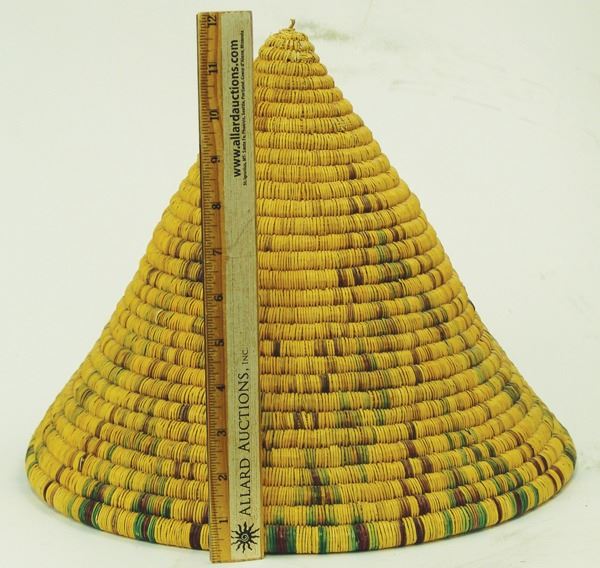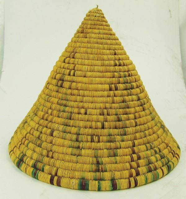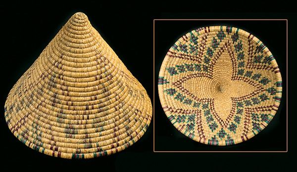 Very rare, conical shaped, polychrome basket with interesting geometric designs. Very good condition, minor fading.Ca.1940s11" x 14"