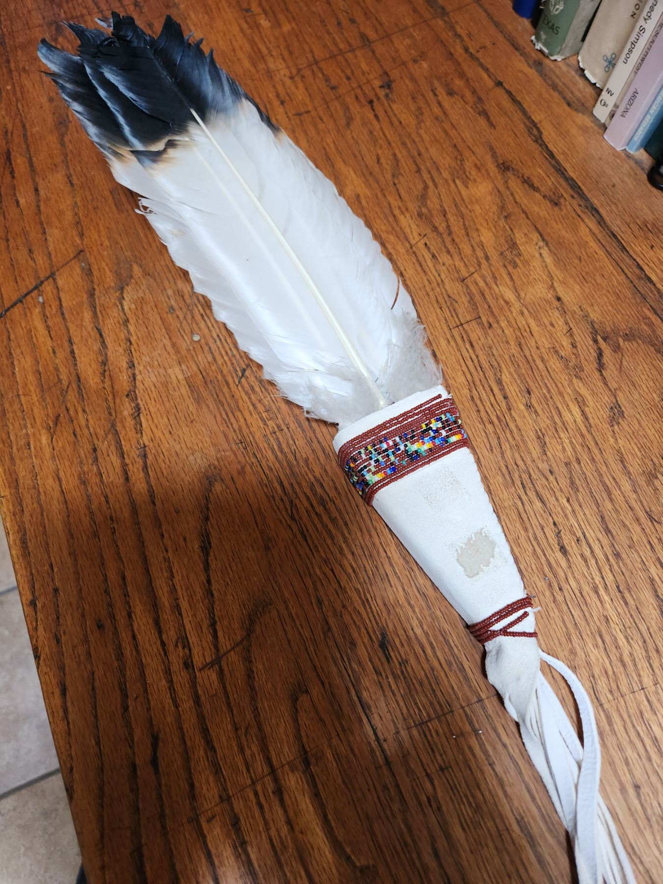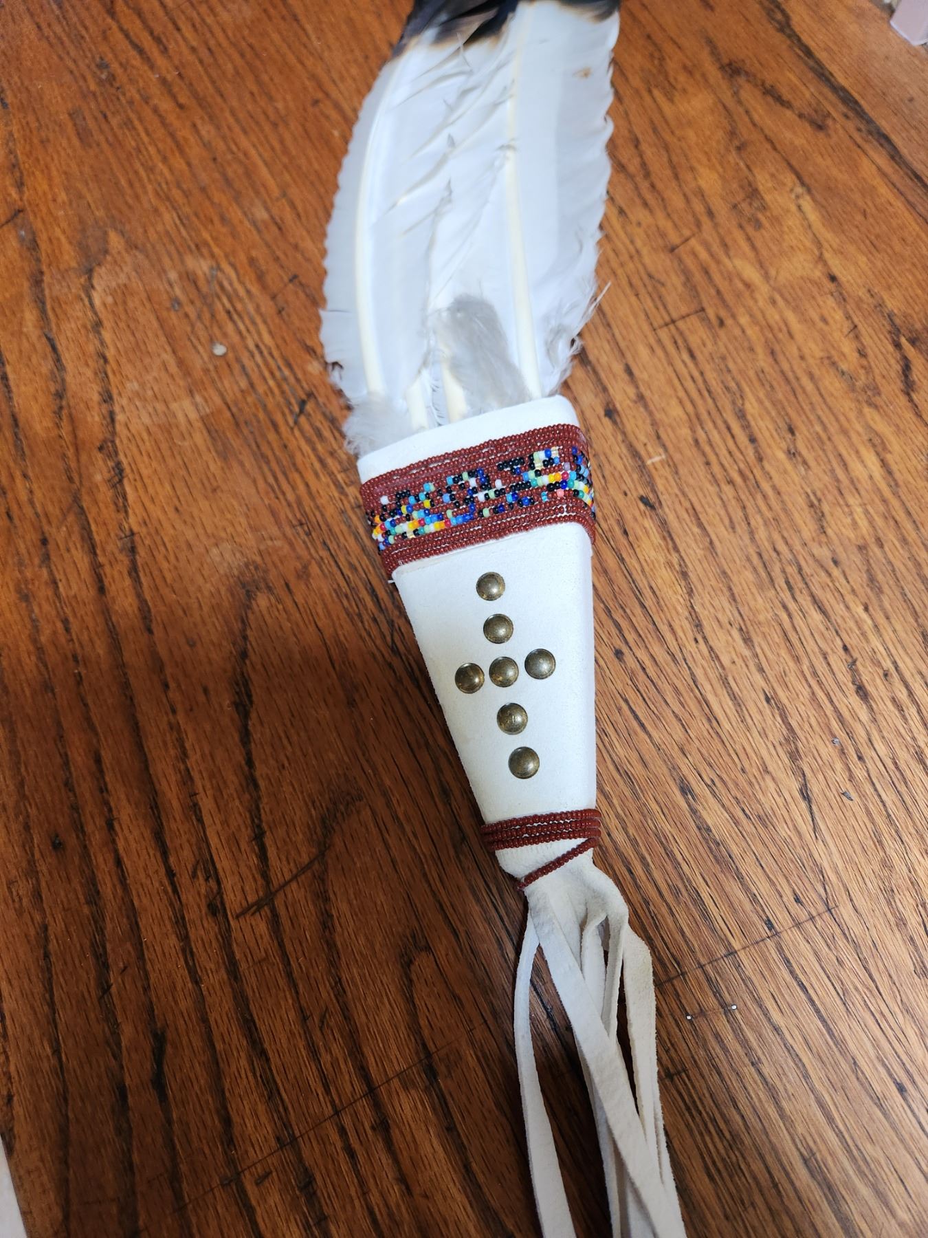 Made with turkey feathers in the 60s. Handle is native-tanned buckskin with brass tacks on front. Backside has adhesive marked from hanging on a wall for over 50 years. Appraisded for $150 in 2005.