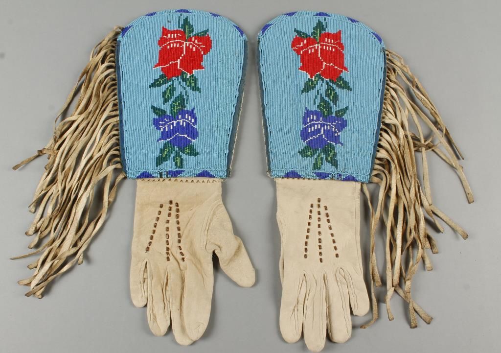 Shoshone fully beaded gauntlets, grain tanned hide. With rose design and fringe, 1940's era. Minor scattered losses, otherwise good overall.