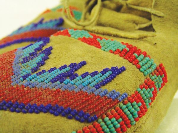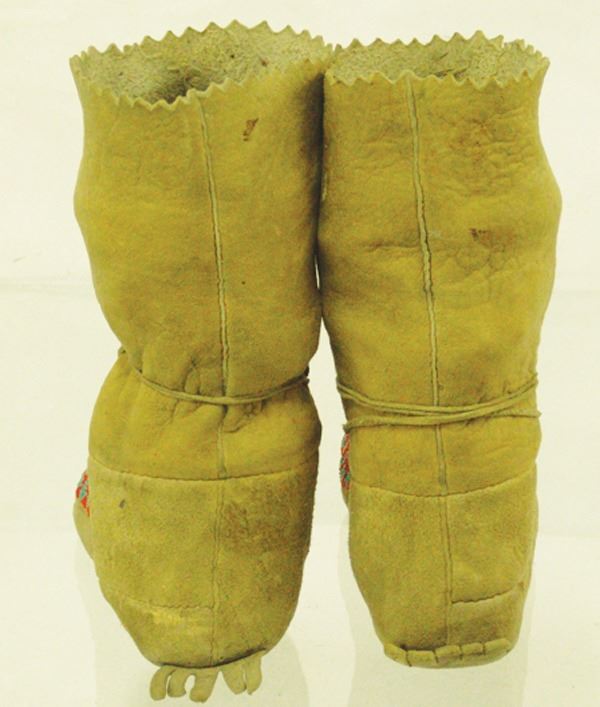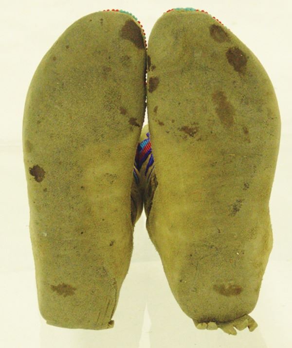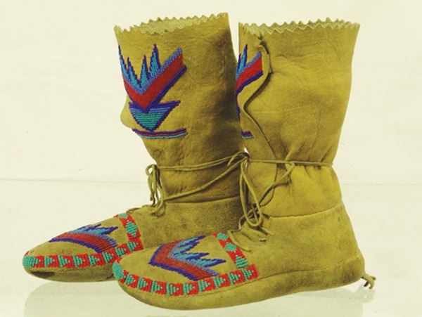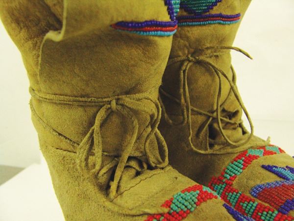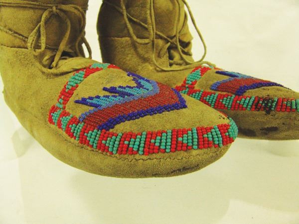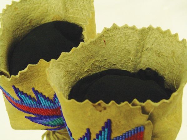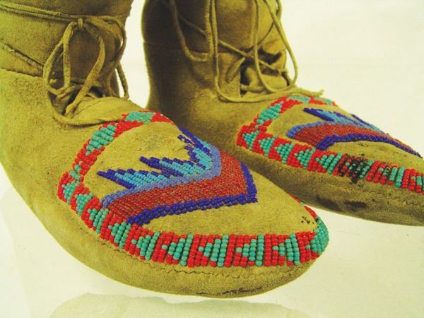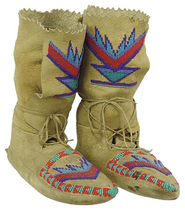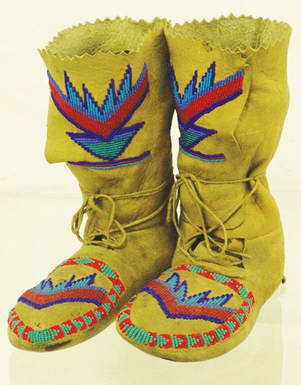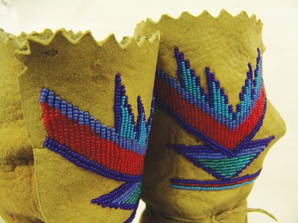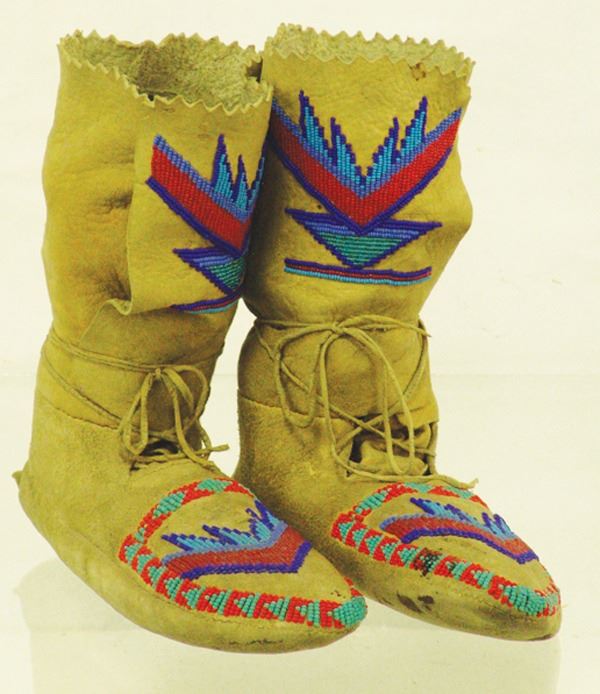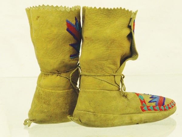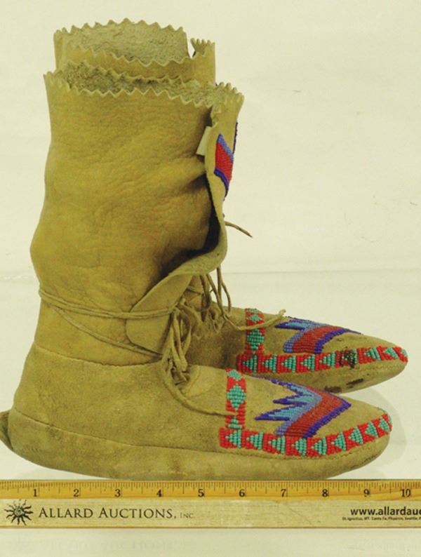 Vintage pair of tanned buffalo hide high top, soft-soled moccasins geometric symbols beaded on the uppers and vamps. Good, used condition.Ca. 1930s10-1/2"