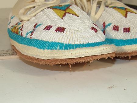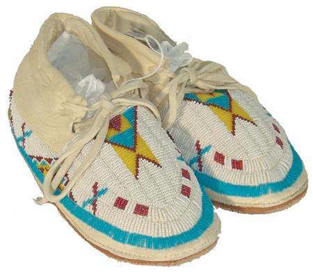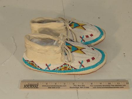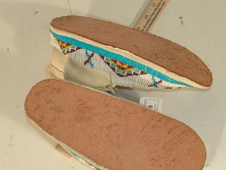 Beautiful pair of lazy stitch beaded white buckskin moccasins with geometric pattern and modern leather soles. Condition: excellent. 10" long.