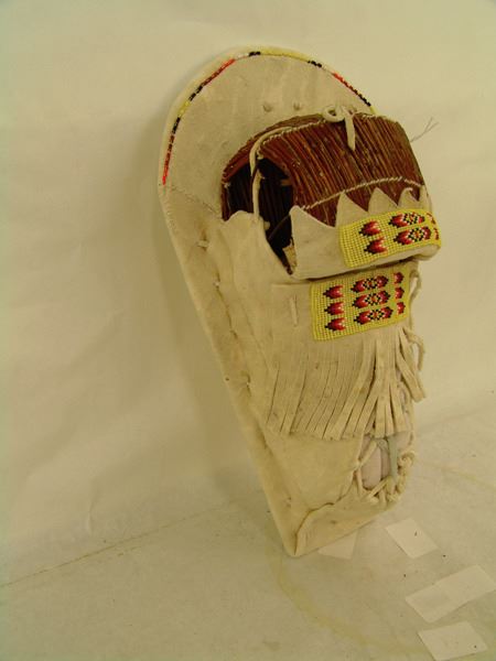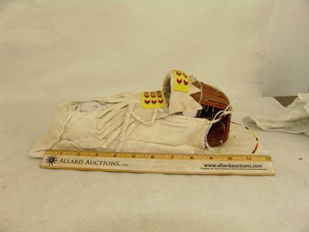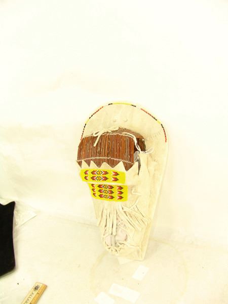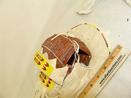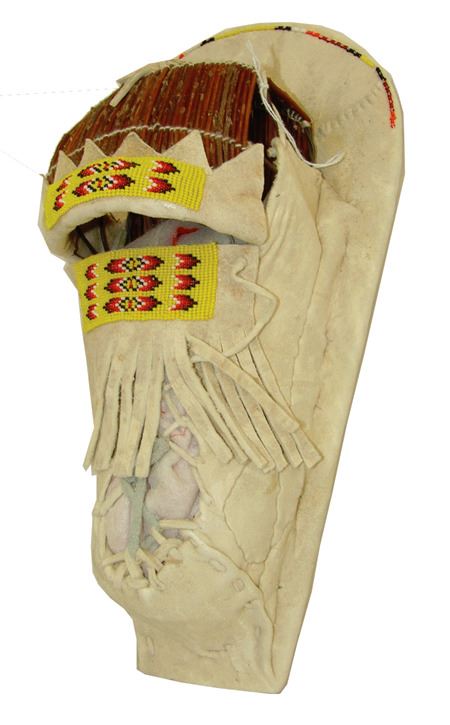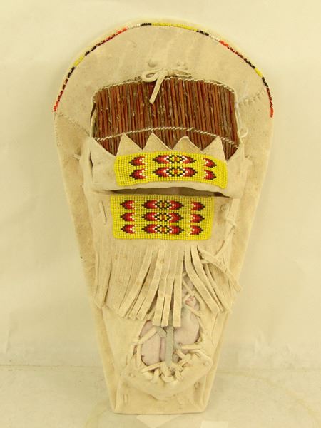 Ca. 1970s, Traditional horseshoe shaped toy cradleboard made from white buckksin witha bent willow sun shade. Very good condition. 14-1/2" x 8" x 5"