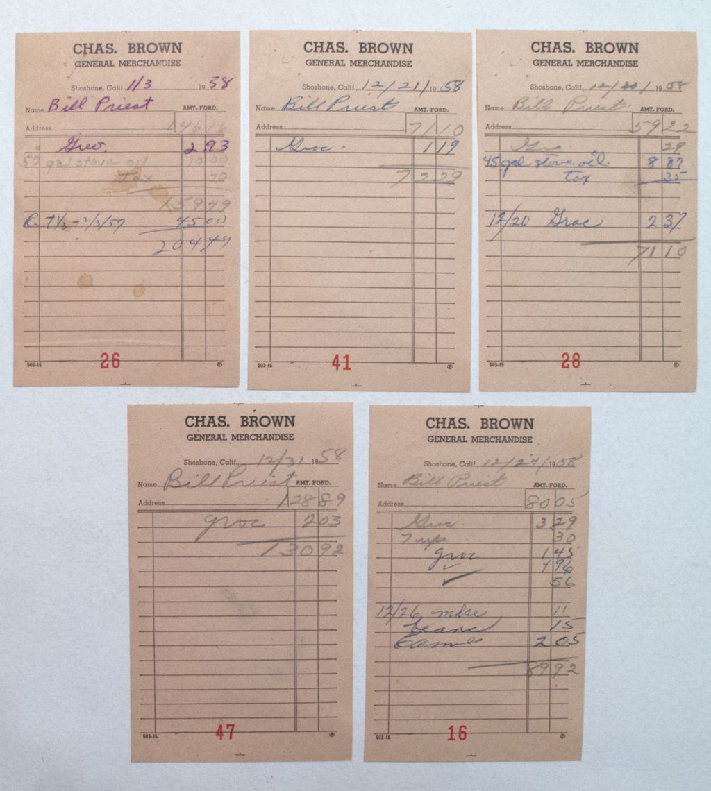 Lot of 5 receipts for goods from the Chas. Brown General Merchandise establishment, for Bill Priest. City:Shoshone County:Inyo County State:CA