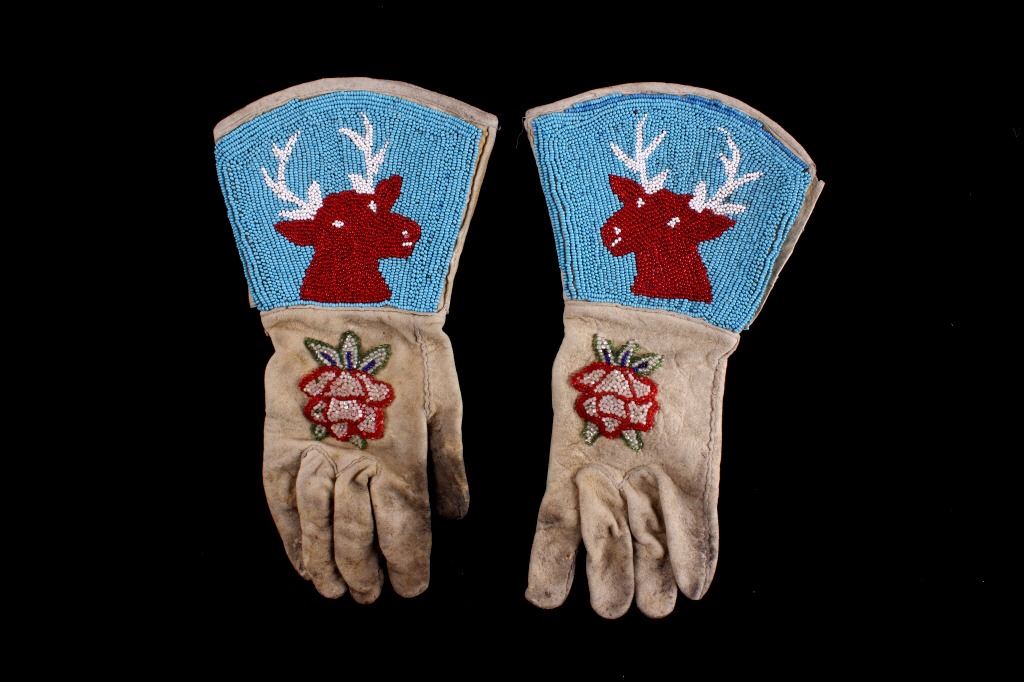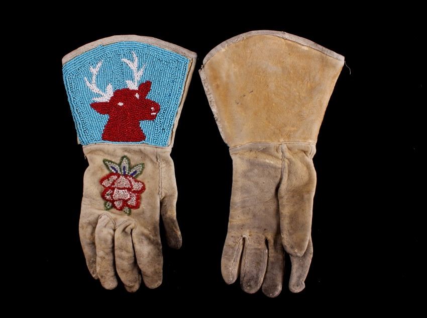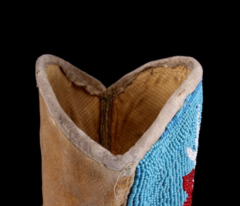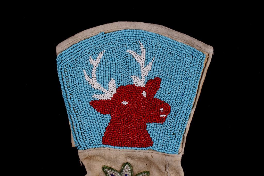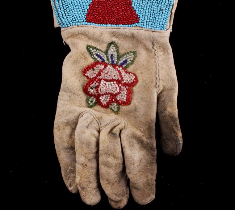 For your consideration are these Wahakee Indian, beaded leather gauntlets, circa 1950's. The gauntlets show leather construction with a trade seed bead decoration in light blue, chalk white, and medium red beads. These gauntlets were traded to a woman in Brigham City, Utah and bought from the daughter of this B.C. woman, named Washakee, in the early 1950's. Washakie was a prominent leader of the Shoshone people during the mid-19th century. The condition of these gauntlets is good, with wear consistent with age and usage. The measurements of these gauntlets are 11 1/2" x 5 1/2" x 3/4".