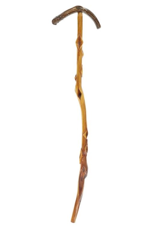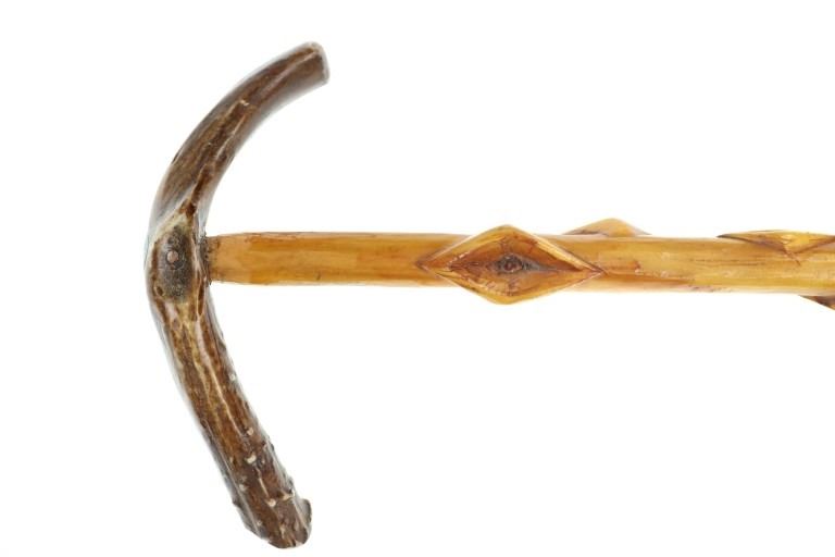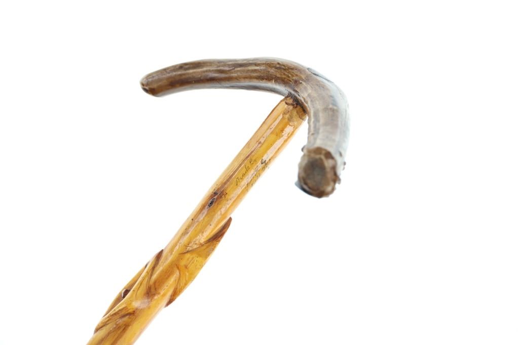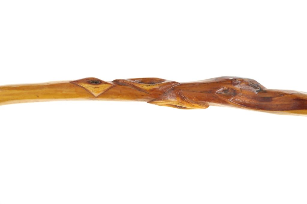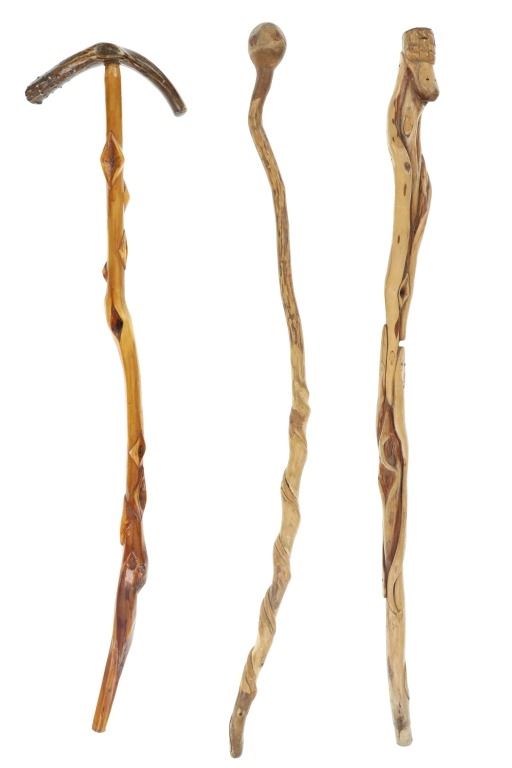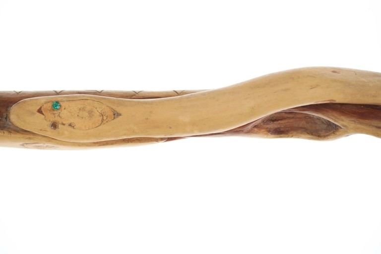 Featured in this lot is this Shoshone Indian carved storyteller walking sticks. There are three walking sticks in this collection. The first shows a stylized snake carved story teller design with inlaid glass jewels to decorate the eyes and inside of nooks in the walking stick. The second is a knob and swirl decorated natural walking stick attributed to the Shoshone Indians with a large bulb at the head of the walking stick. The last is a coupled deer antler and carved wooden construction attributed to the Shoshone Indians with diamonds carved into the natural wooden shaft. The condition of this collection of Shoshone walking sticks is well preserved with no obvious signs of damage and shows a well preserved overall condition. The measurements of this collection of walking sticks is