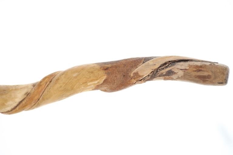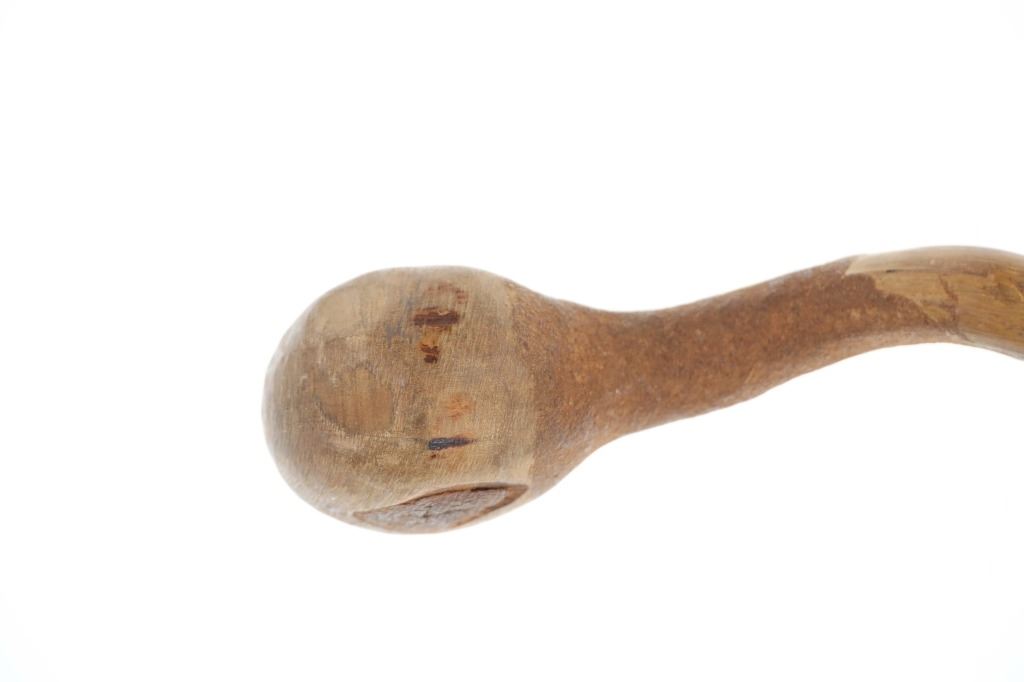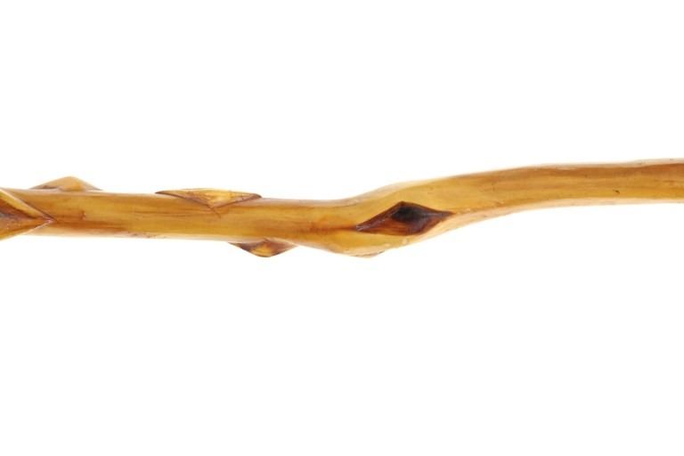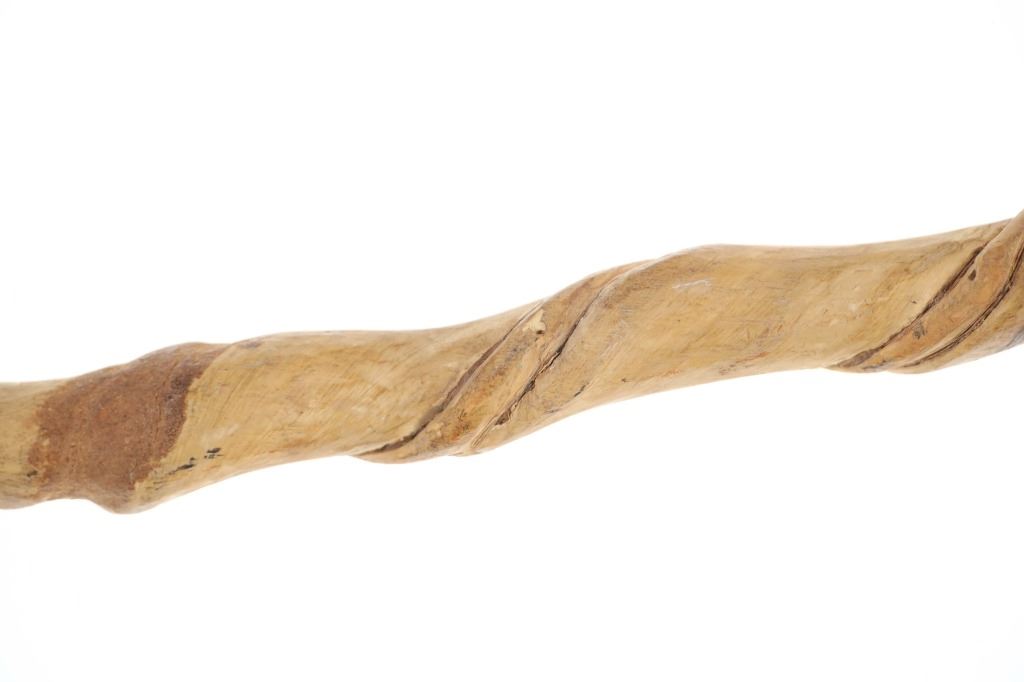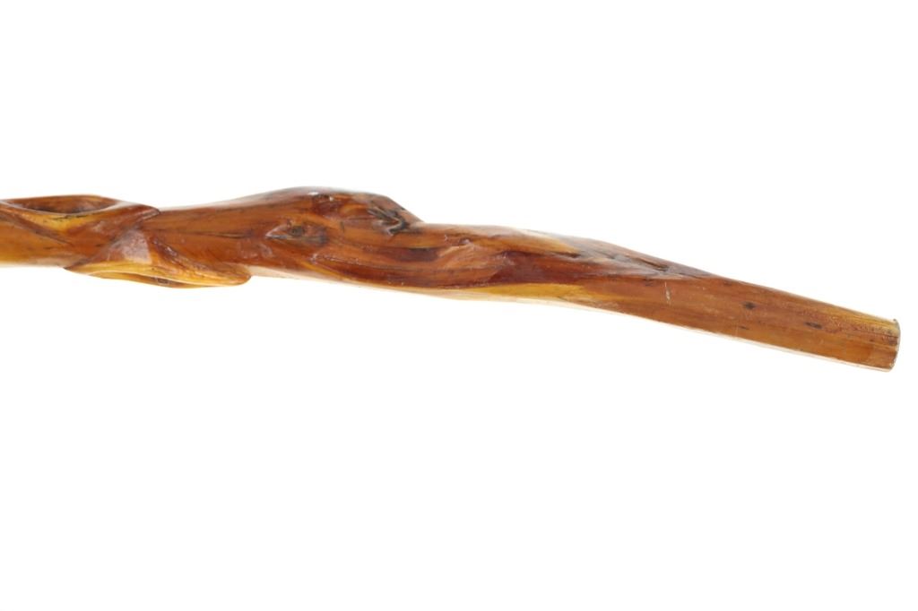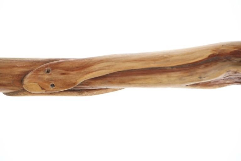 Featured in this lot is this Shoshone Indian carved storyteller walking sticks. There are three walking sticks in this collection. The first shows a stylized snake carved story teller design with inlaid glass jewels to decorate the eyes and inside of nooks in the walking stick. The second is a knob and swirl decorated natural walking stick attributed to the Shoshone Indians with a large bulb at the head of the walking stick. The last is a coupled deer antler and carved wooden construction attributed to the Shoshone Indians with diamonds carved into the natural wooden shaft. The condition of this collection of Shoshone walking sticks is well preserved with no obvious signs of damage and shows a well preserved overall condition. The measurements of this collection of walking sticks is