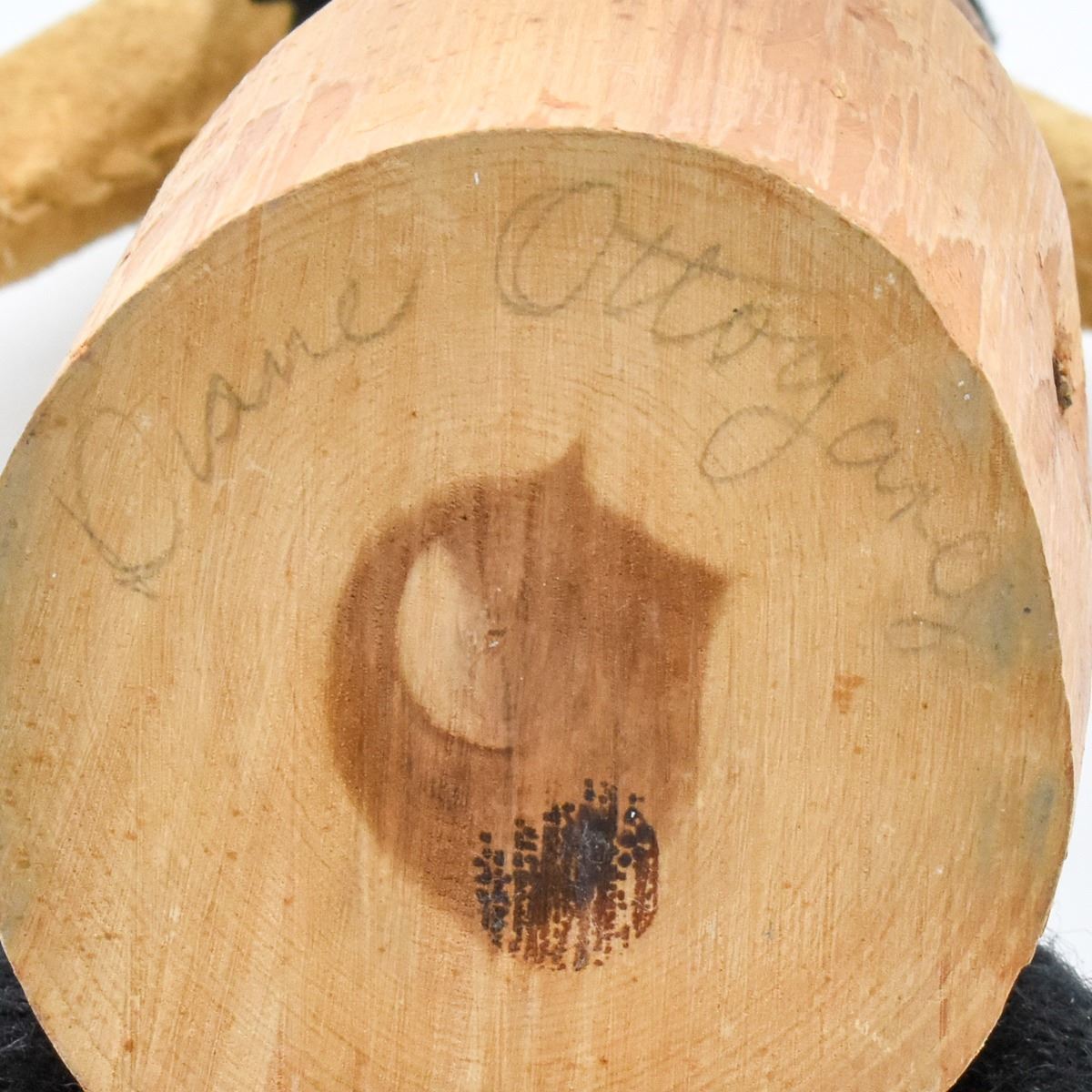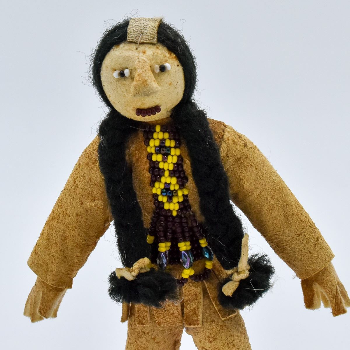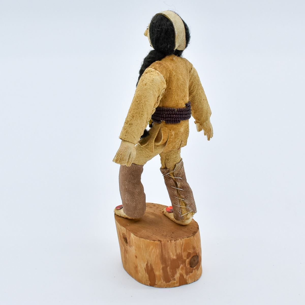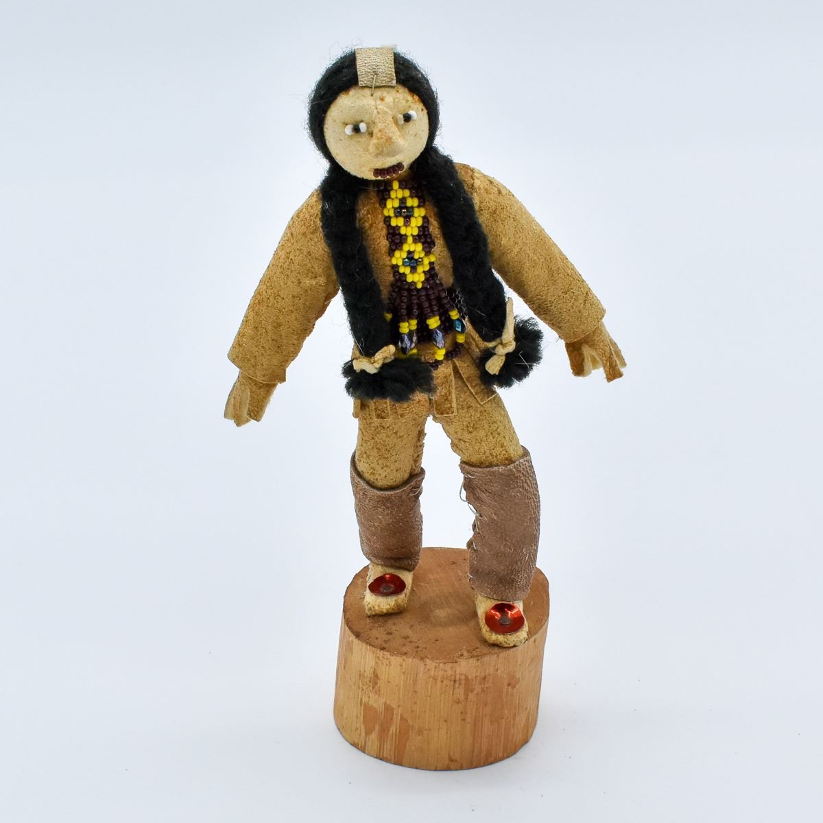 Native American Shoshone Leather Bannock Doll by Diane Ottogary, measures 4'' x 8'' x 3'' and is signed on the bottom, yarn hair, beaded leather top, leggings, and face, on wood stand