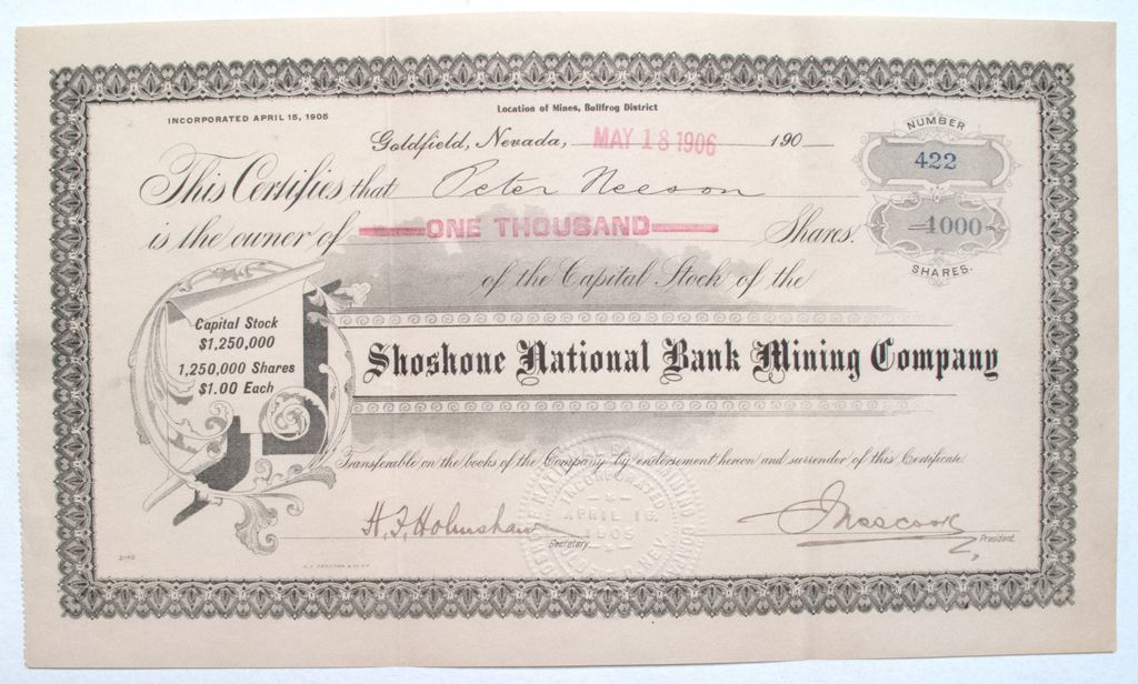 Incorporated April 15, 1905 (does not specify where). No. 422 issued May 18, 1906 to Peter Neeson for 1000 shares. Signed by the President, Jno Cook and H.F. Holmshaw, Secretary. Printed by H.S. Crocker & Co., S.F.. U/C. Black ink on crème paper. No vignette. Location of mines, Bullfrog District. This company appears to be the same property as the Bullfrog National Bank, but we are unsure how they are related. They could be two different issues floated for the same property, which would be unethical promoting. The other possibility is that the company was a rip-off of the real National Bank property.City: BullfrogCounty: EsmeraldaState: NV
