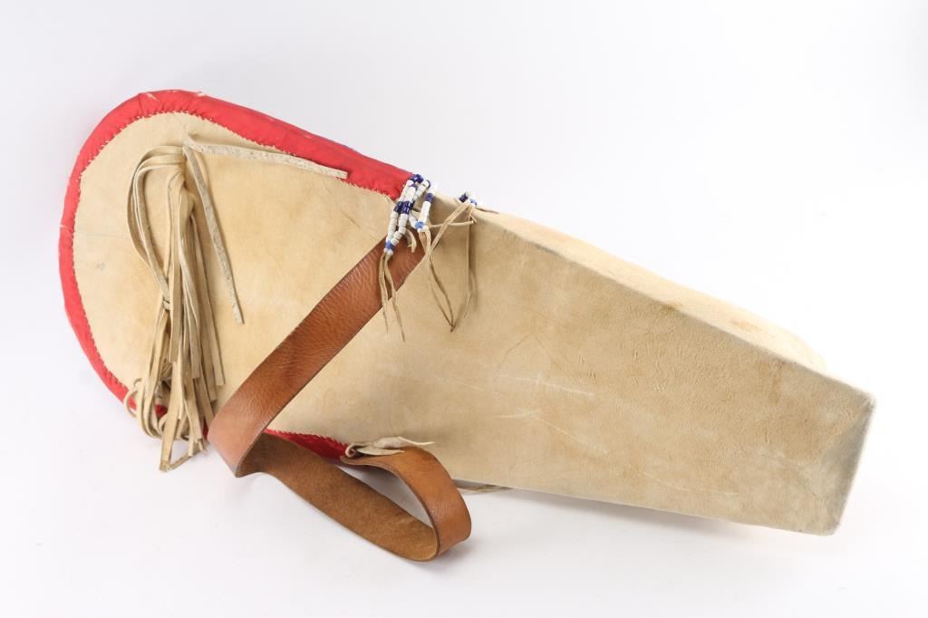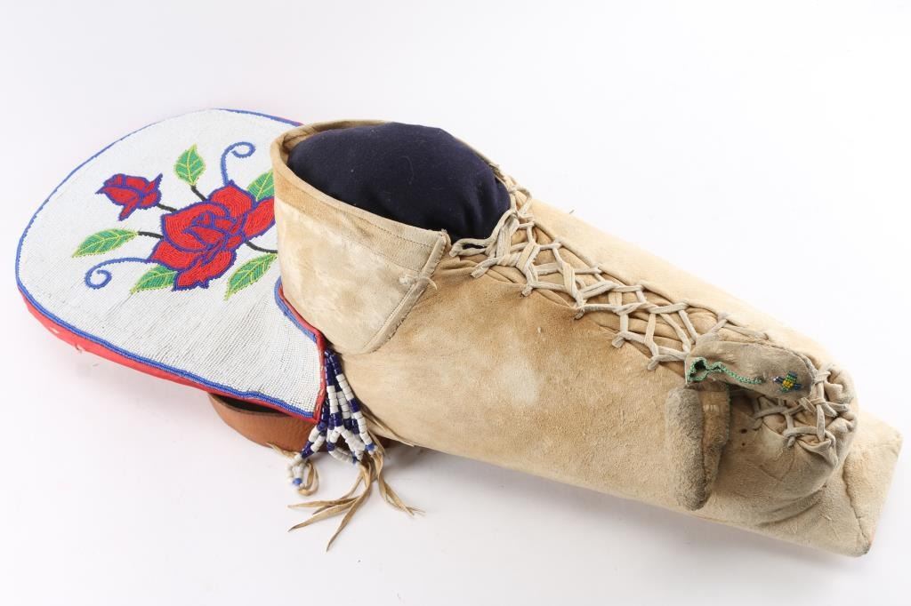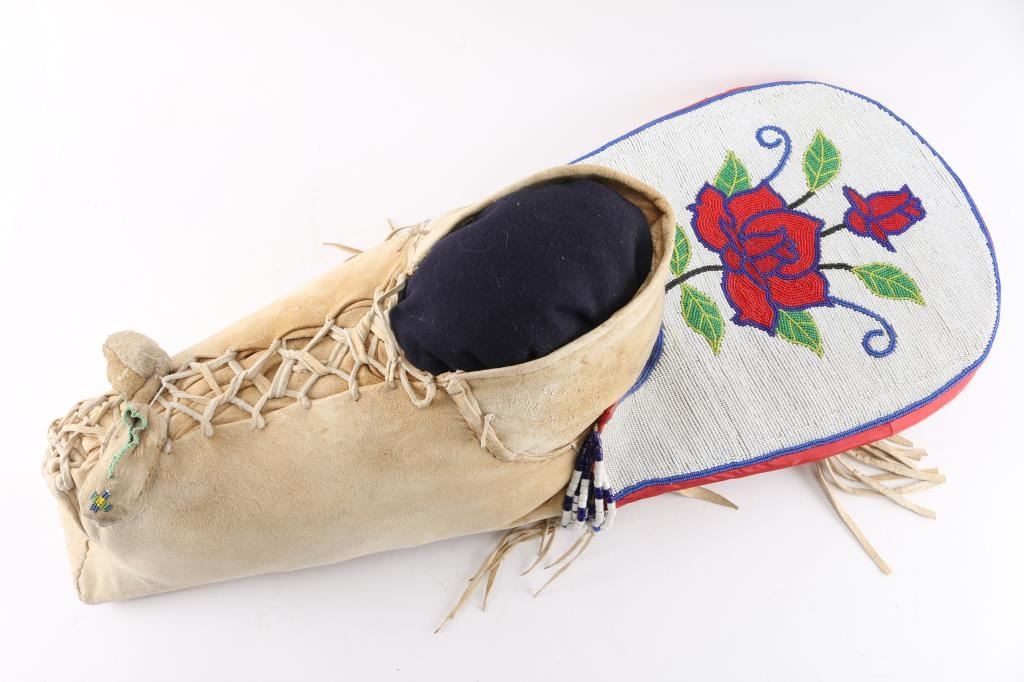 Tanned leather cradle board beaded with white back ground with red rose design beaded tassells with baby moccasins. Measures 34"x13"