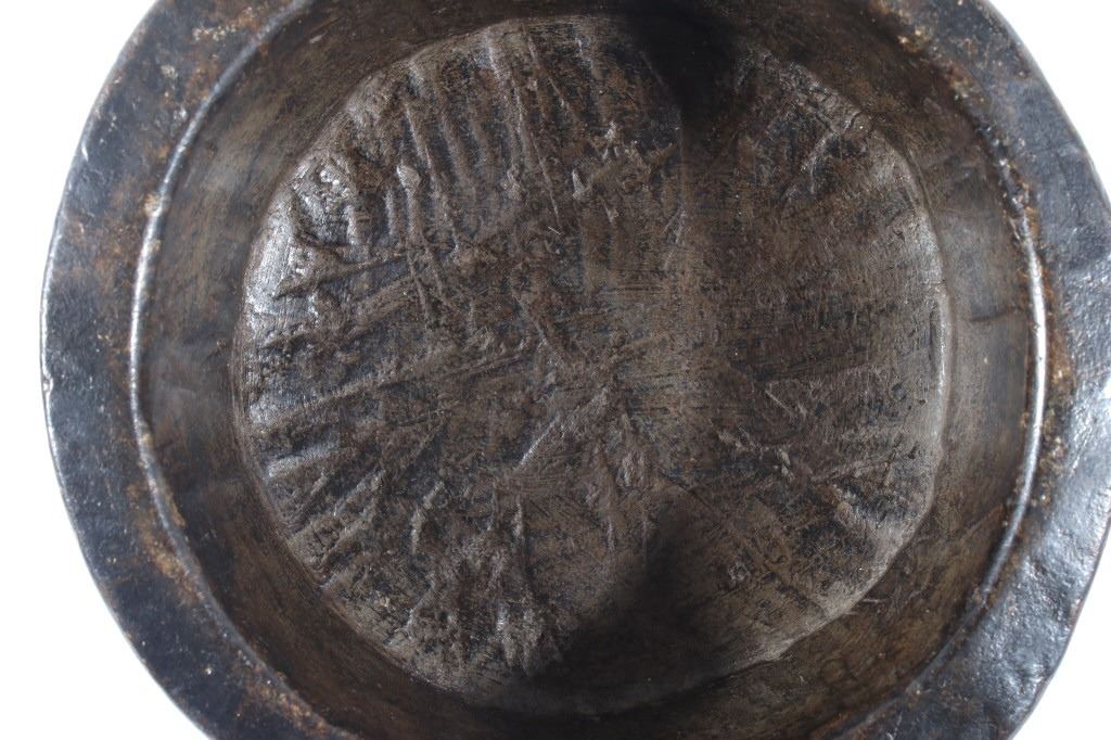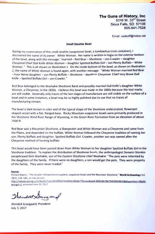 This is a historic and important steatite stone carved cooking vessel or bowl from the Shoshone Native American Indian people of the 19th Century. The bowl was said to have been made in the 1860's. The bowl was owned by the daughter of Cheyenne Chief Dull Knife, White Woman who was wife to Red Bear. The bowl has been examined and authenticated by renowned historian and Togia language expert, Wendell Grangaard of The Guns of History, Inc. These vessels have been documented as being a rich historic Shoshone Native American Indian tradition as being “inherited by the daughters of the family. If there were no daughters, a son would get the pots, They were property of the family. They were never traded” as stated by anthropologist Demtri Shimkin paraphrased Dick Washakie, son of the Eastern Shoshone Chief Washakie. On the exterior bottom of the bowl the owners name, White Woman is carved, along with the following message: “married – Red Bear – Shoshone – son Crawler – daughter Cheyenne Chief Dull Knife White Woman – daughter Spotted Buffalo Girl – son Plenty Buffalo – White Woman.” The previous carving is shown in illustration 1. On the inside of the bowl written in Togia Lakota Language as shown in Illustration 2 is another message, “White Woman married Red Bear – Four Horse Daughter – son Plenty Buffalo – Shoshone – daughter Cheyenne Chief Very Brave Dull Knife – Spotted Buffalo Girl – son Crawler.” The piece comes with the signed letter describing the piece’s history from Wendell Grangaard along with a detailed illustration showing the markings he has translated. Wendell Grangaard is the foremost knowledge on the Togia language along with the Battle of the Little Bighorn as he is the author of the book, “Documenting the Weapons Used at Little Bighorn” 2015. Wendell was also intricate in the authentication and examination of the historic George Armstrong Custer Captured Sharps Carbine from Chief Black Kettle that sold at auction for $127,000. Comes with documentation including a detailed description authenticating the piece signed by Wendell, along with a illustration showing the togia language carvings drawn. Other documentation includes “The Greater Yellowstone Ecosystem, soapstone bowls and the Mountain Shoshone: by Richard Adams. Accompanied by the bowl is the original museum tag from the Sioux Nation Historical Museum of Sioux Falls, South Dakota from curator Douglas Vernon. Also accompanying this lot is the book “Storied Stone: Indian Rock Art of the Black Hills Country” by Linea Sundstrom from 2004 University of Oklahoma Press. In the book on page 42 it states, “The Oglala holy man Nickolas Black Elk told of Lakota use of rock art in the Black Hills: “There is a place in the Black Hills, also on the Little Big Horn, a bank of solid rock where there are inscriptions that only a medicine man can read. It is a mystery…” Also on page 69 and page 179 are depictions of typical phosphene or entopic designs that match the symbols documented to be found in the rock art of the Black Hills. Many if not all of these symbols that are shown and documented to be authentic uses of Lakota language were also passed down to Wendell Grangaard. This book virtually confirms the authentic documentation of these togia language carvings in the historic rock carvings of the Lakota Sioux in Wyoming, South Dakota and Montana. Early Native American Indian Steatite bowls with no documentation or carvings are still of a highly collectible nature with some examples selling at auction such as the California Coastal bowl that sold for $3,000 and was valued at $8,000 in 2014. This bowl carrys a much more important historic and collectible value as it has been documented to have been carved by a Cheyenne and Shoshone woman. Measures overall 5.75”x5.5” and 2” thick. The bowl was informally appraised by Grangaard at over $20,000.