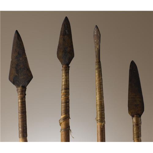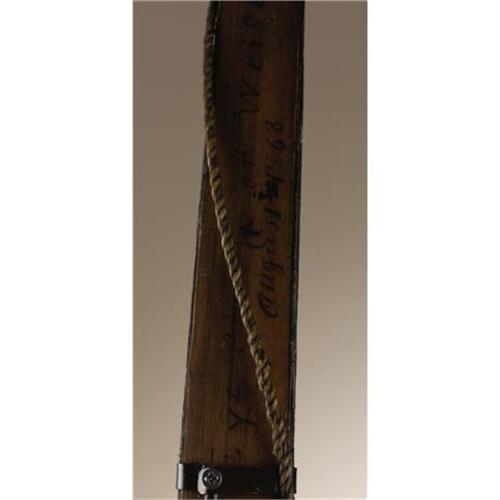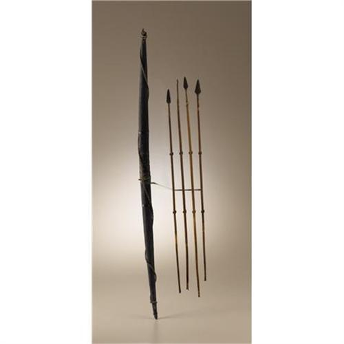 <B>Shoshoni Chief Eagle Eye's Bow and Arrows captured from him in Idaho Territory, 1868</B></I><BR>Circa 1868<BR>Length 34 in. the bow; Length 26 3/4 in. the longest arrow<BR><BR>"This important bow and arrow set of historical significance is a masterpiece of American Indian archery. It is a composite bow of wood, sinew backed and sealed with pitch and/or animal tallow, with rawhide wrappings at its grip area concealing bird quills and exhibiting good age and manufacture. This perfectly tillered bow, the relationship and balance of each bow limb to pull uniformly, is a perfect example of the type used in the northwestern Plains and eastern Plateau. Its pull weight would be estimated to be about 40 pounds. Only a few similar examples exist, some made from elk antler are even more rare...The bow retains its original multi-strand, twisted sinew string, again demonstrating a high degree of skill in its making.<BR>"Of the thousands of arrows this author has seen, these arrows represent the finest example of a 'Plains' type self-arrow, that is, of one-piece construction. They average 25 inches in length and the 1/4 inches diameter midsection tapers gracefully to both the distal and proximal end, which finishes in a perfectly expanding nock. Two straight shallow grooves representing 'spirit lines' are evident on each arrow. These arrows are carefully hand-hewn to be of the correct spine, meaning, matched to the bow's weight for perfect cast. Few aboriginal arrows exhibit such care in manufacture. The well-fitted points are of native manufacture, and the short cropped fletching would give uniform and speedy flight. There is no doubt this matched set represents one of the best examples of the American Indian bowyer's craft and would be a very formidable weapon in the hands of a warrior on horseback."1<BR>The words "Eagle Eye Chief of WeiserSnake Indians, August, 1868" and "Presented to Col. Sinc