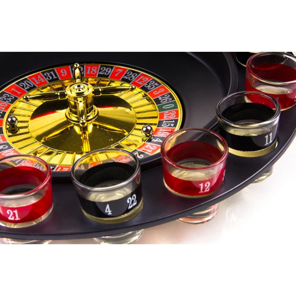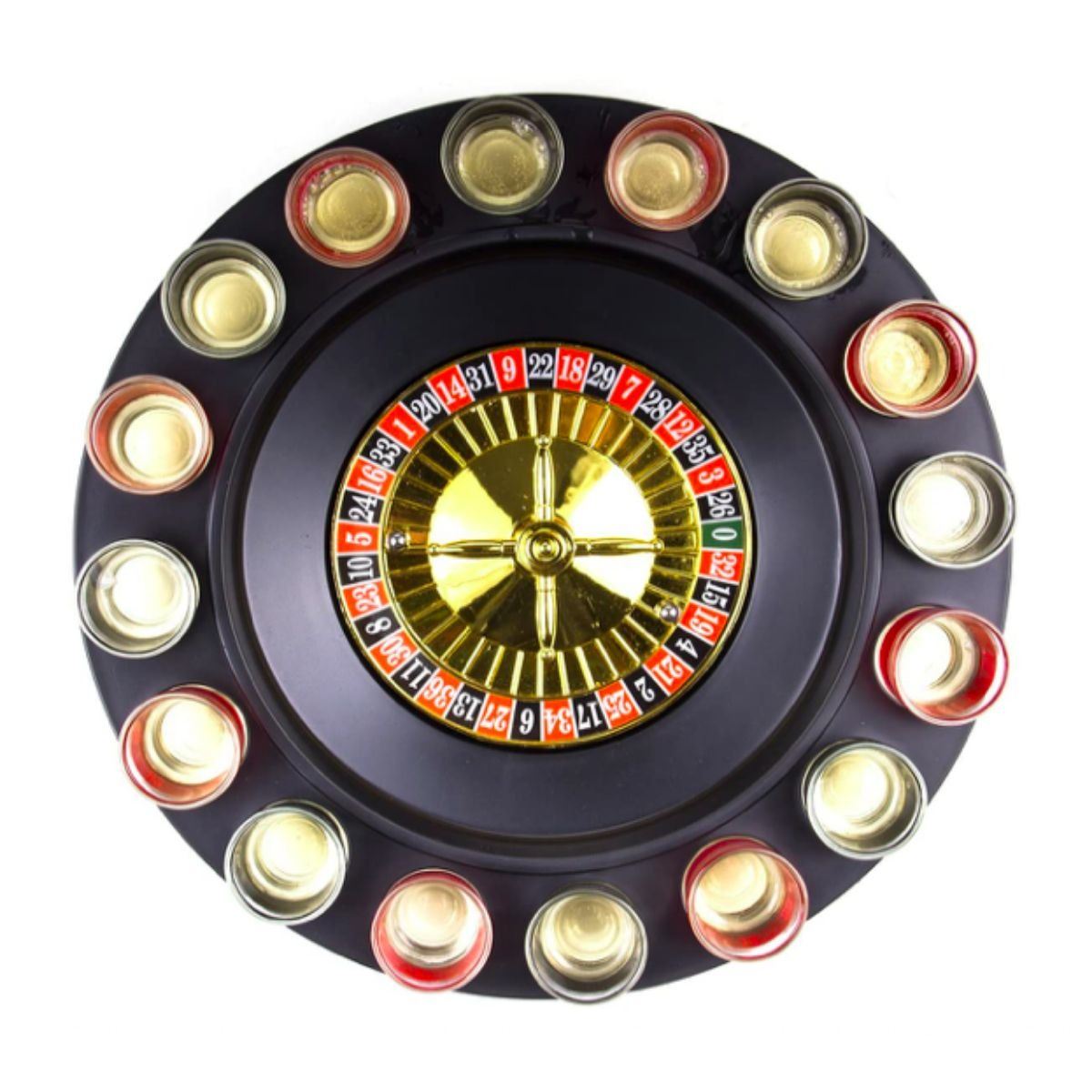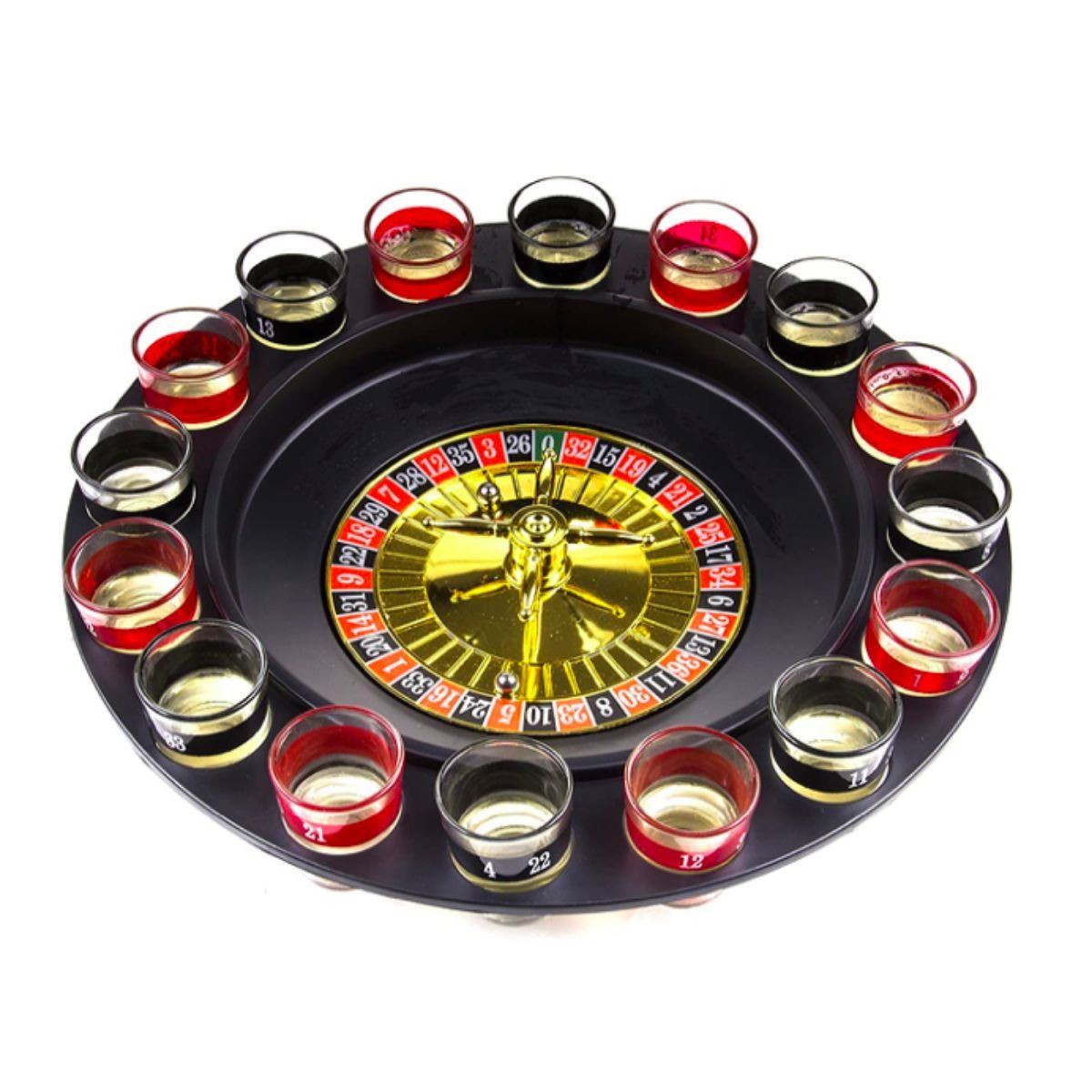 Shot Glass drinking game Roulette Wheel set, includes 16 numbered shot glasses, two metal balls, and a spinning roulette wheel with shot glass holders. Fun, simple game - fill shot glasses with drink of choice, place each in a holder around the wheel & spin. In new, unused condition, in original box. 11.75 x 11.75 x 2.5". 2.12 lb weight.