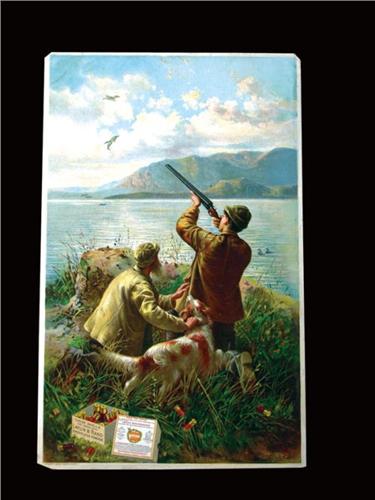 Shot Shell Box Cardboard Insert for Laflin and Rand Shot Shells. Dated 1898, depicting two hunters with dog shooting birds. Crease upper left corner otherwise excellent condition. 8 1/2 X 13 1/2 inches.