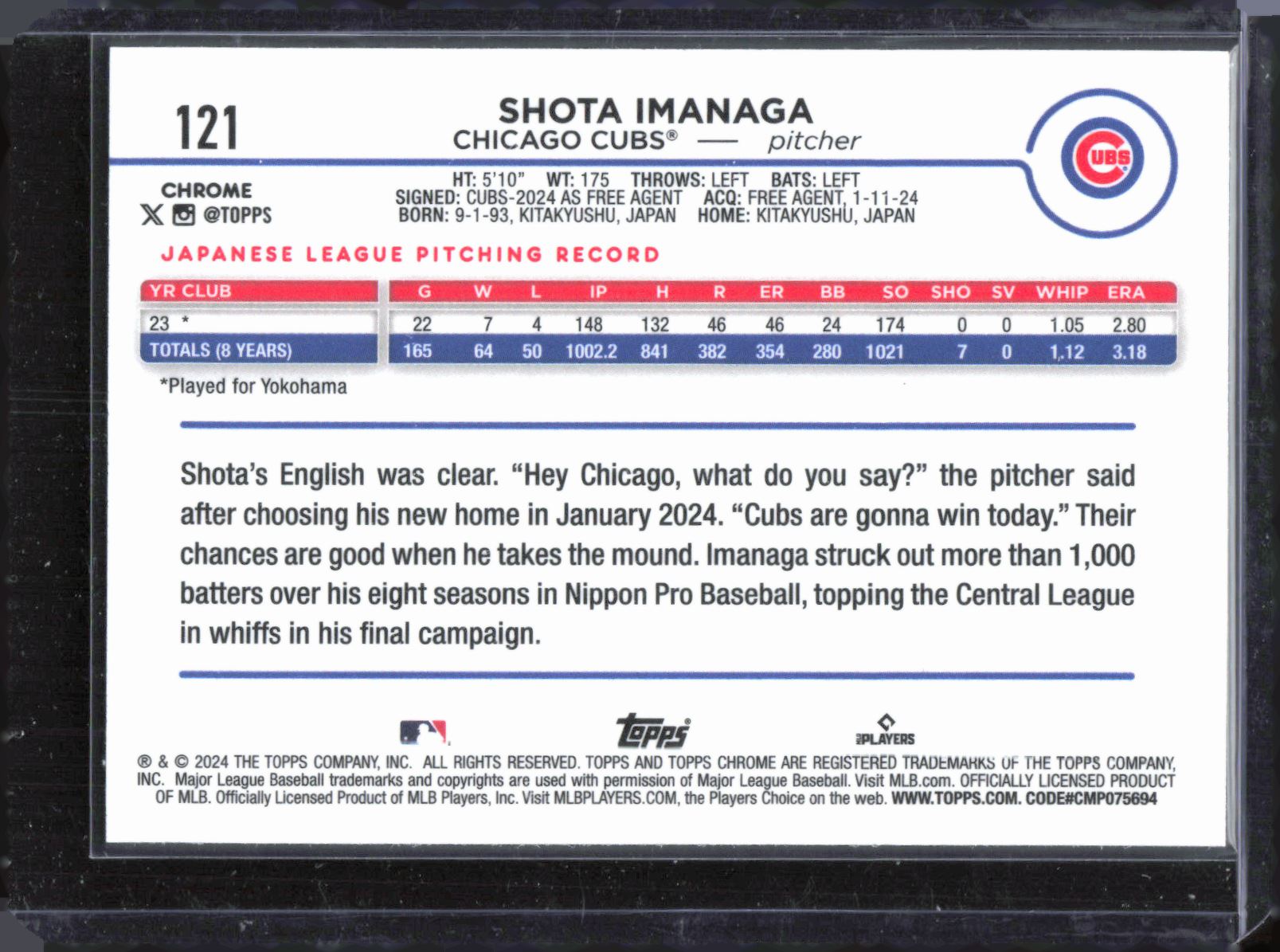 Shota Imanaga Raywave Refractor RC 2024 Topps Chrome #121