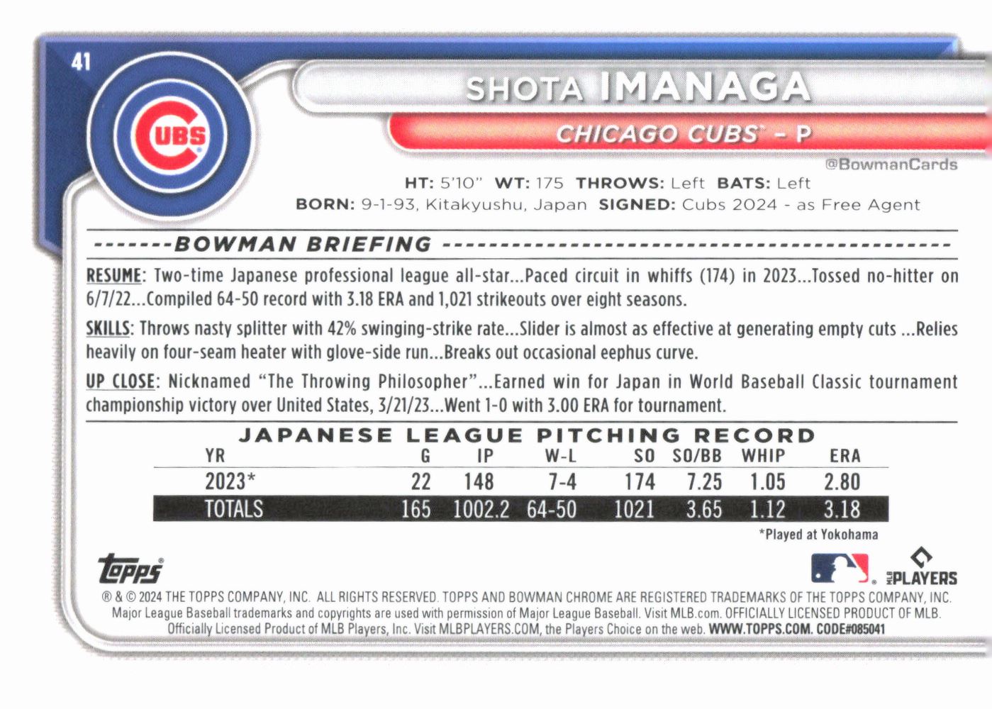 Shota Imananga Rookie Card 2024. Bowman Chrome, Chicago Cubs.