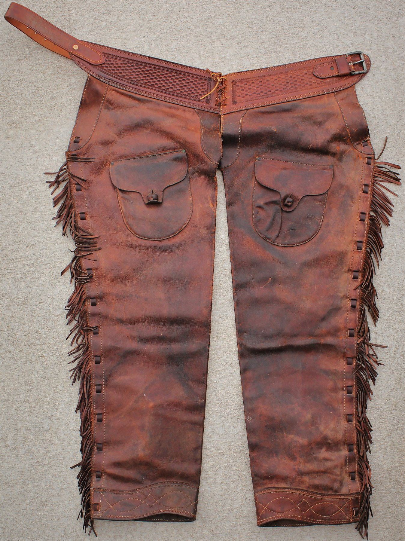 Large pair of beautifully colored shotgun chaps with fringed legs and basket stamped belt and replaced billet.