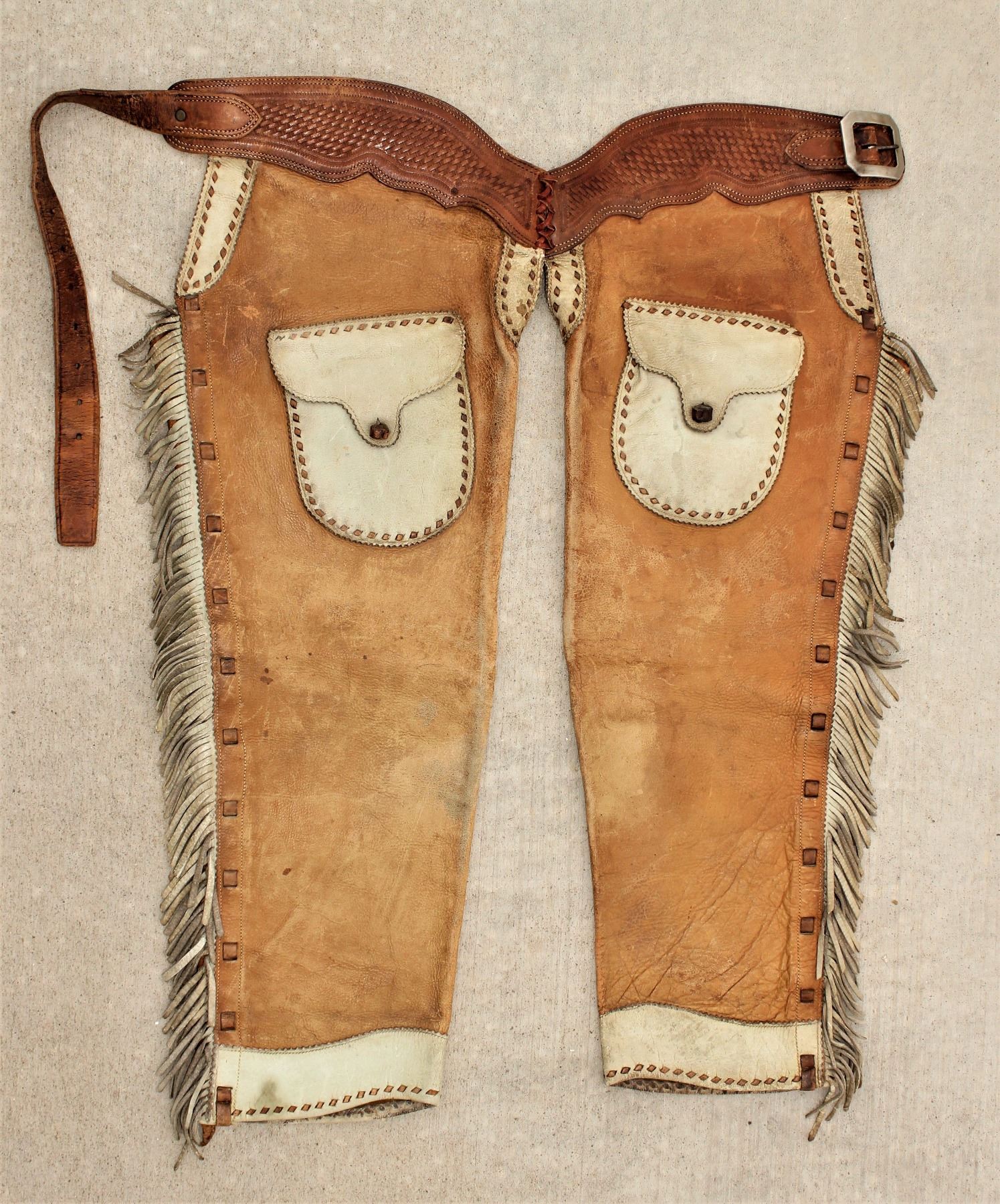 An unmarked pair of tri-colored chaps with basket stamped belt, pockets, and fringe. A great looking pair of chaps in crisp condition.