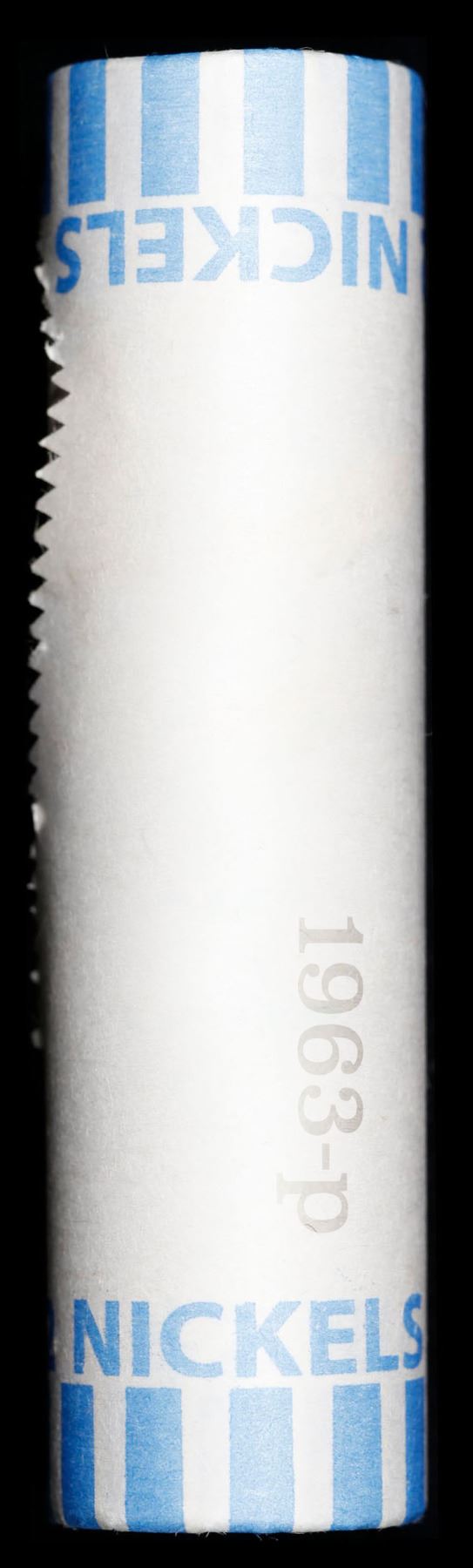 Shotgun Jefferson 5c roll, 1963-p 40 pcs Bank Wrapper. A terrific Shotgun roll of unsearched Jefferson nickles. Most if not all coins should be gem or better