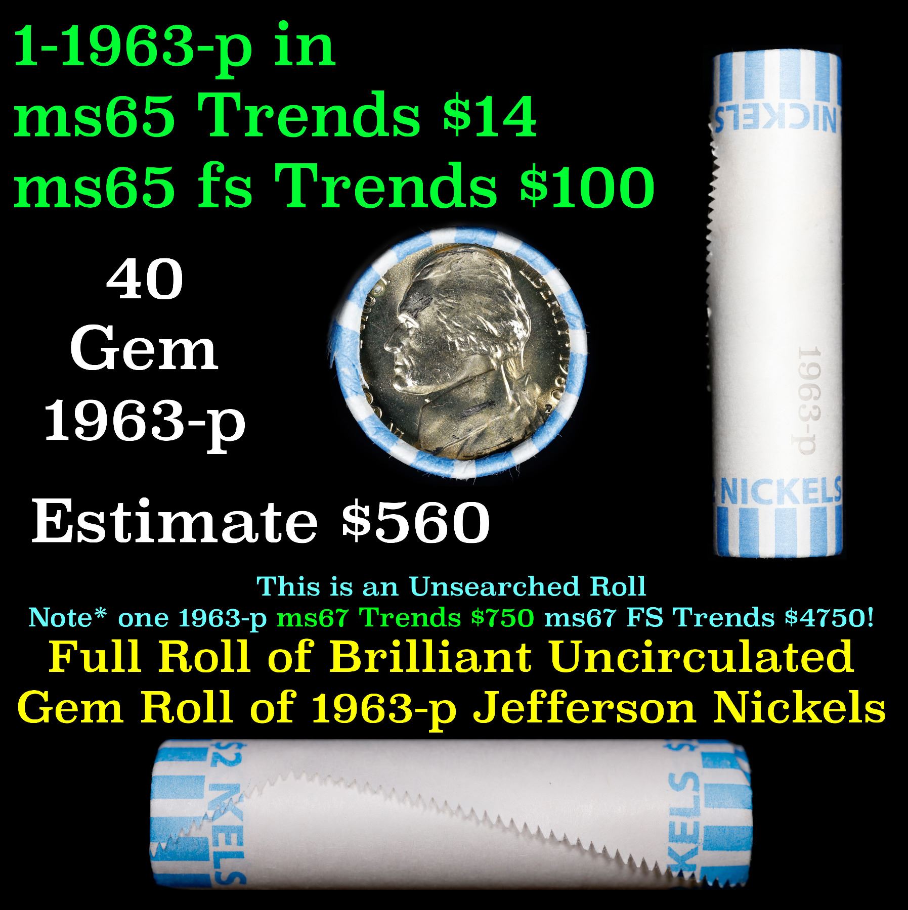 Shotgun Jefferson 5c roll, 1963-p 40 pcs Bank Wrapper. A terrific Shotgun roll of unsearched Jefferson nickles. Most if not all coins should be gem or better