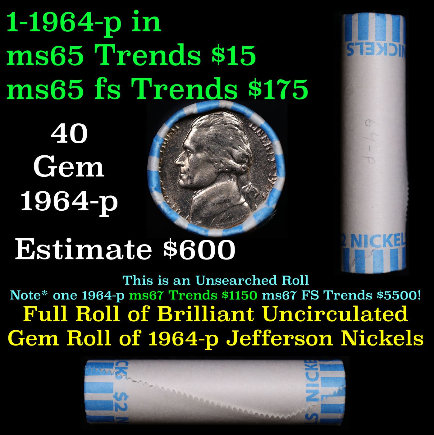 Shotgun Jefferson 5c roll, 1964-p 40 pcs Bank Wrapper. A terrific Shotgun roll of unsearched Jefferson nickles. Most if not all coins should be gem or better