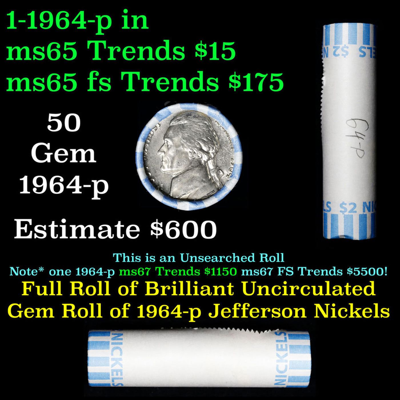 Shotgun Jefferson 5c roll, 1964-p 40 pcs Nickel Wrapper. A terrific Shotgun roll of unsearched Jefferson nickles. Most if not all coins should be gem or better