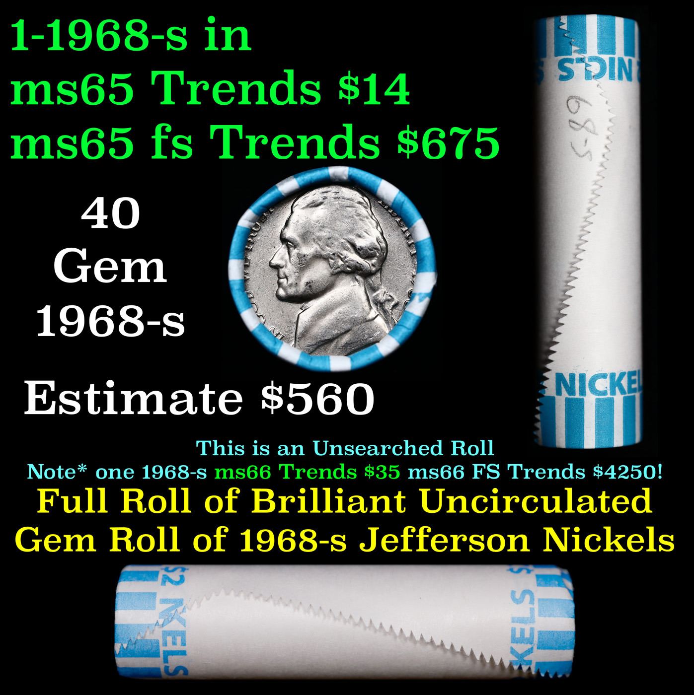 Shotgun Jefferson 5c roll, 1968-s 40 pcs Bank Wrapper. A terrific Shotgun roll of unsearched Jefferson nickles. Most if not all coins should be gem or better
