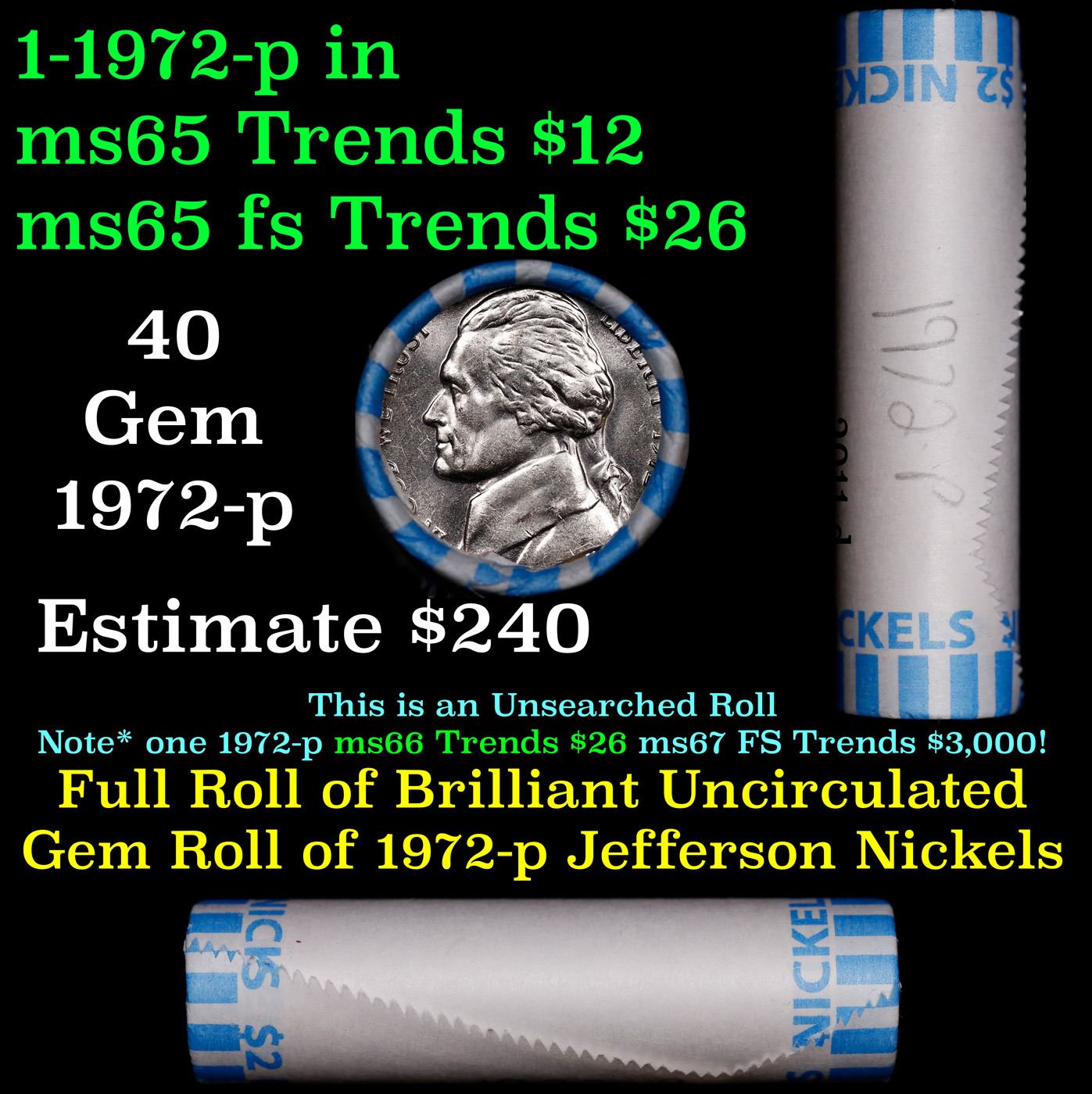 Shotgun Jefferson 5c roll, 1972-p 40 pcs Bank Wrapper. A terrific Shotgun roll of unsearched Jefferson nickles. Most if not all coins should be gem or better