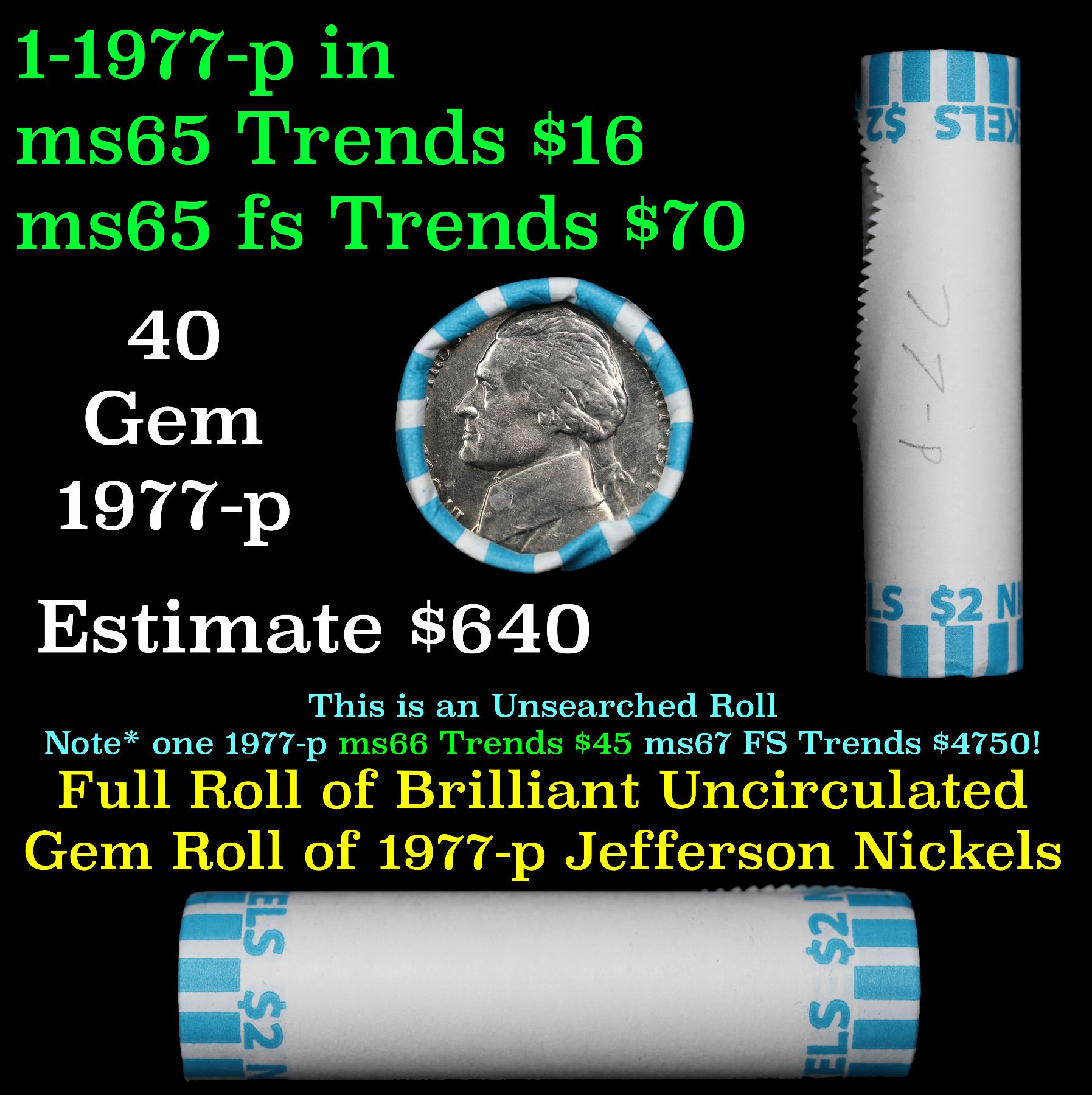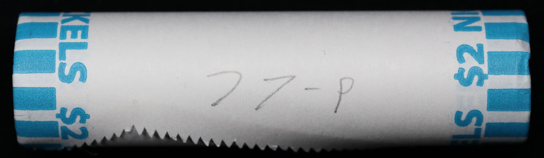Shotgun Jefferson 5c roll, 1977-p 40 pcs Bank Wrapper. A terrific Shotgun roll of unsearched Jefferson nickles. Most if not all coins should be gem or better
