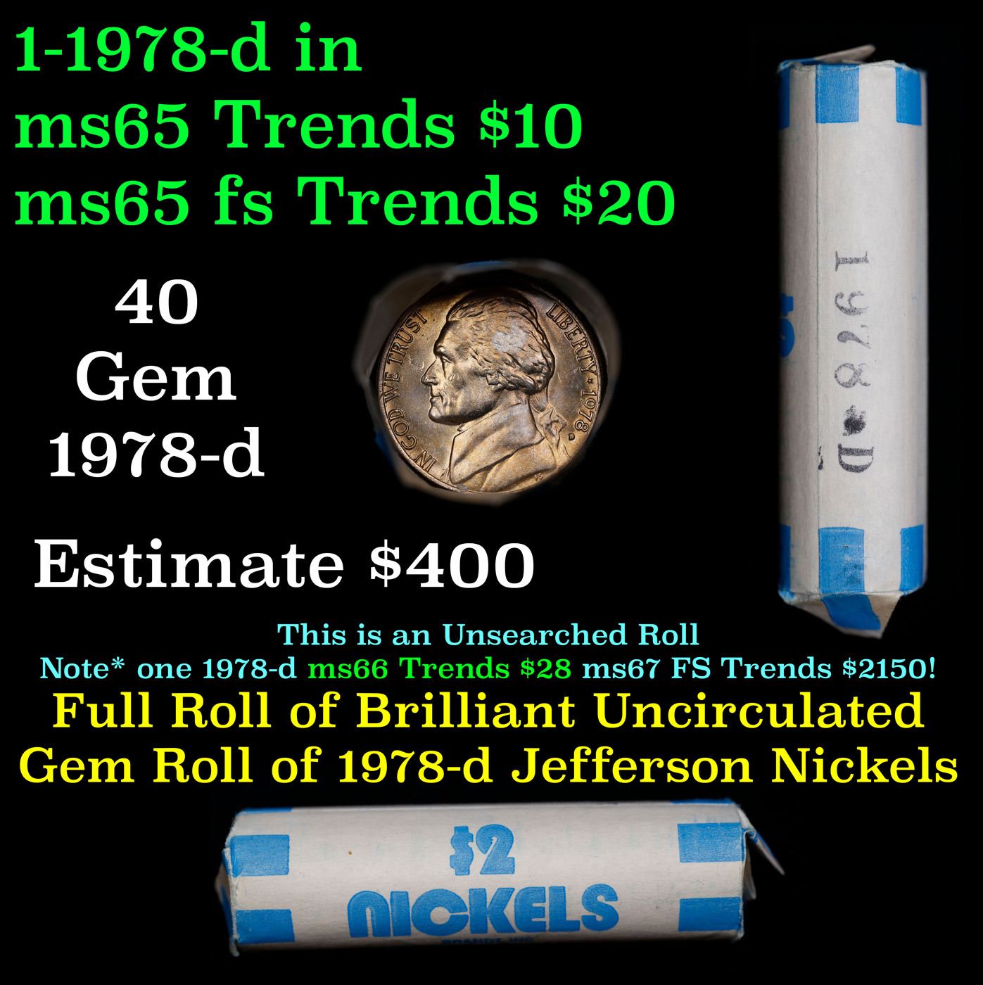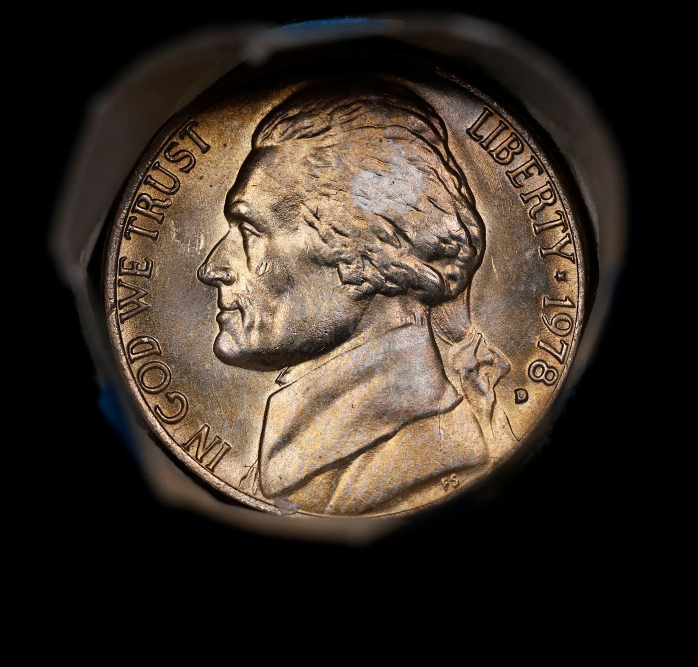 Shotgun Jefferson 5c roll, 1978-d 40 pcs Brandt Wrapper. A terrific Shotgun roll of unsearched Jefferson nickles. Most if not all coins should be gem or better