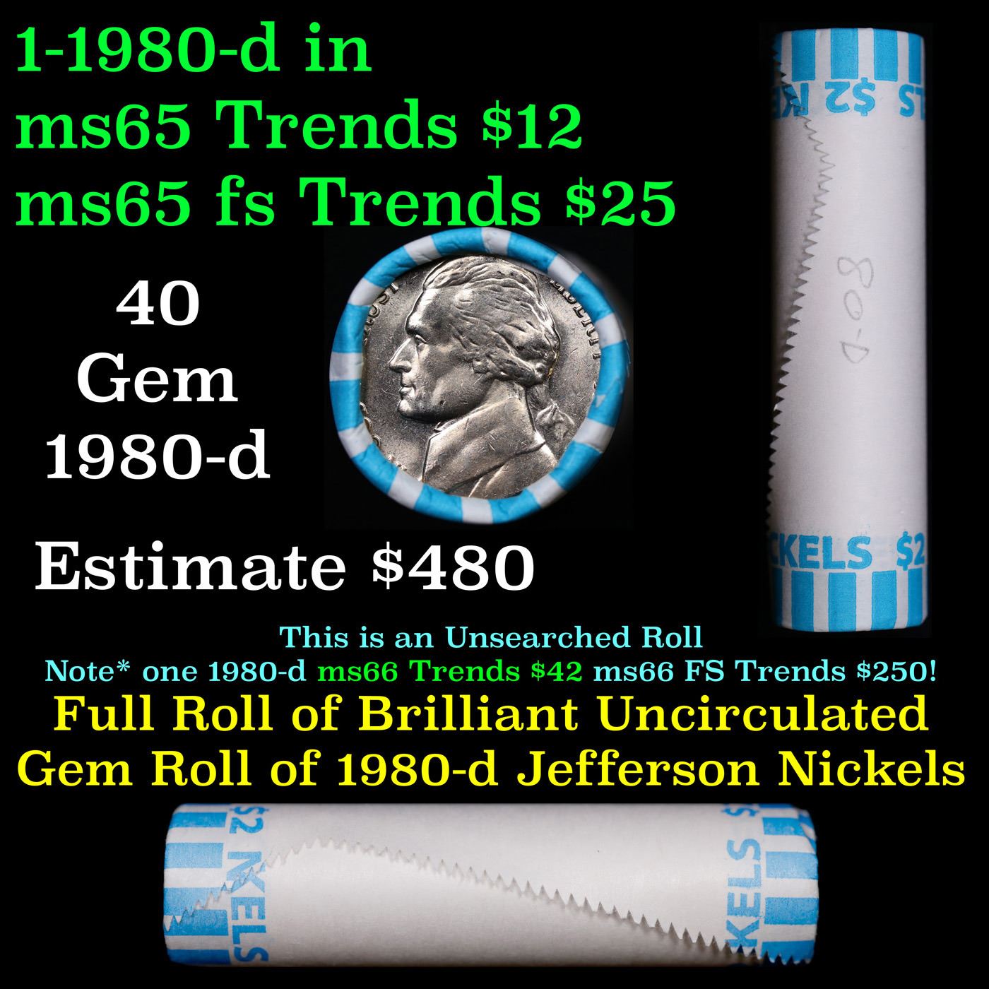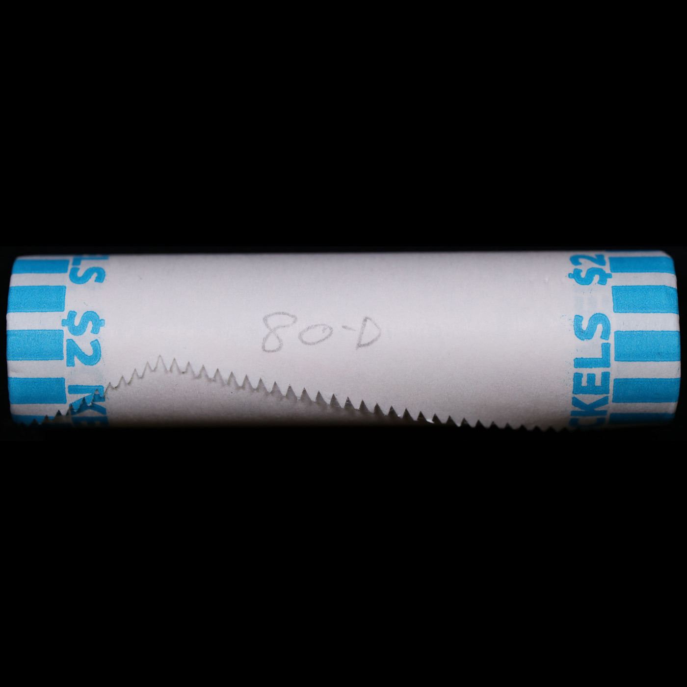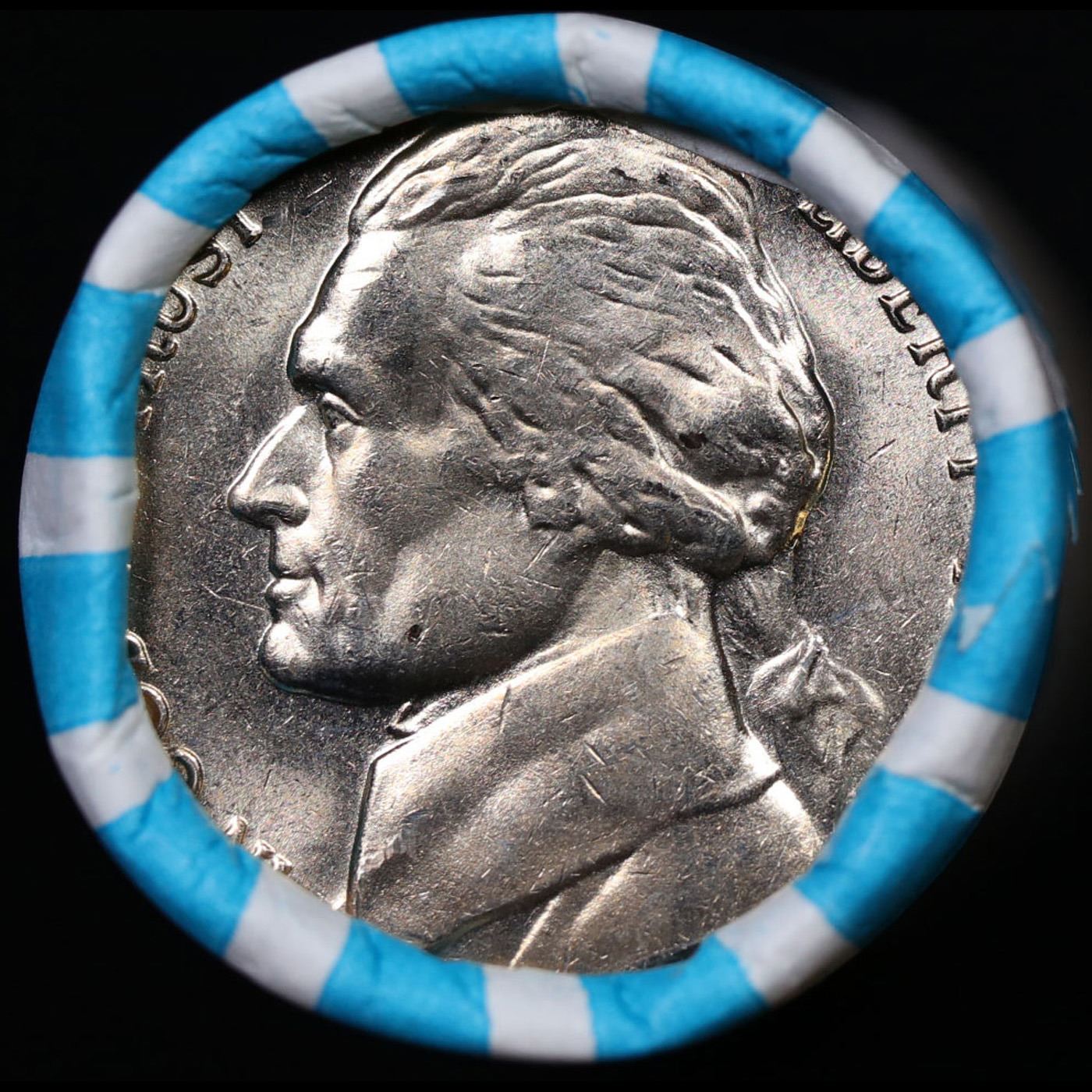 Shotgun Jefferson 5c roll, 1980-d 40 pcs Bank Wrapper. A terrific Shotgun roll of unsearched Jefferson nickles. Most if not all coins should be gem or better