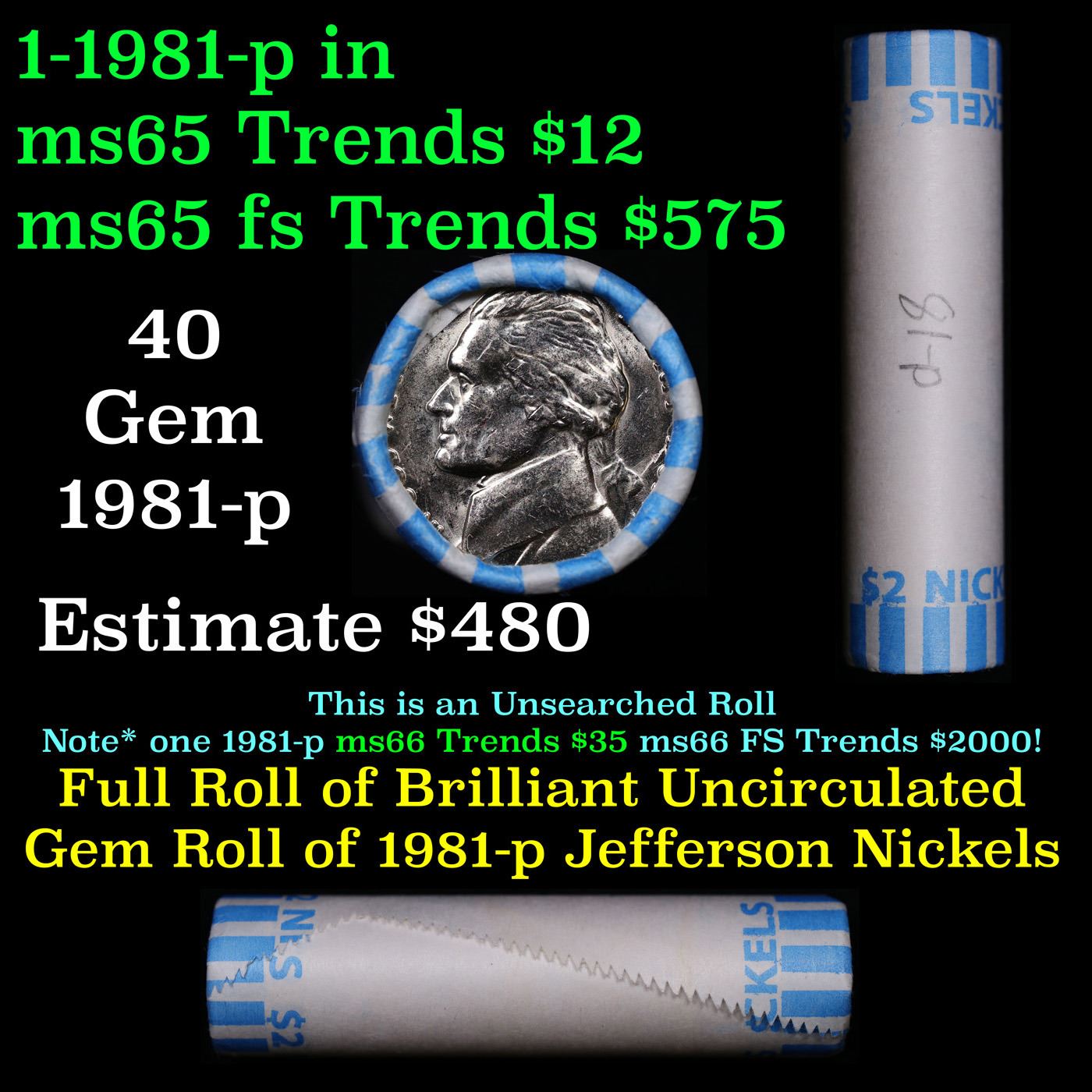 Shotgun Jefferson 5c roll, 1981-p 40 pcs Bank Wrapper. A terrific Shotgun roll of unsearched Jefferson nickles. Most if not all coins should be gem or better