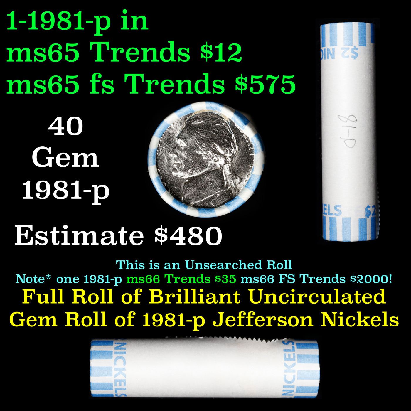 Shotgun Jefferson 5c roll, 1981-p 40 pcs Nickel Wrapper. A terrific Shotgun roll of unsearched Jefferson nickles. Most if not all coins should be gem or better