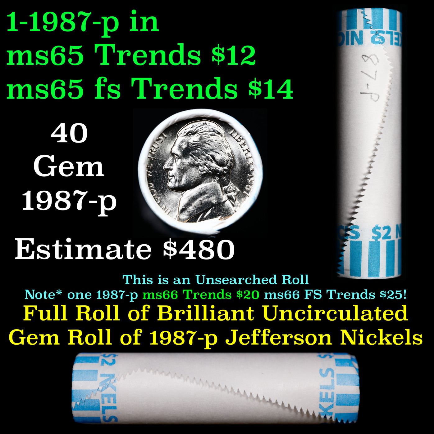 Shotgun Jefferson 5c roll, 1987-p 40 pcs Bank Wrapper. A terrific Shotgun roll of unsearched Jefferson nickles. Most if not all coins should be gem or better