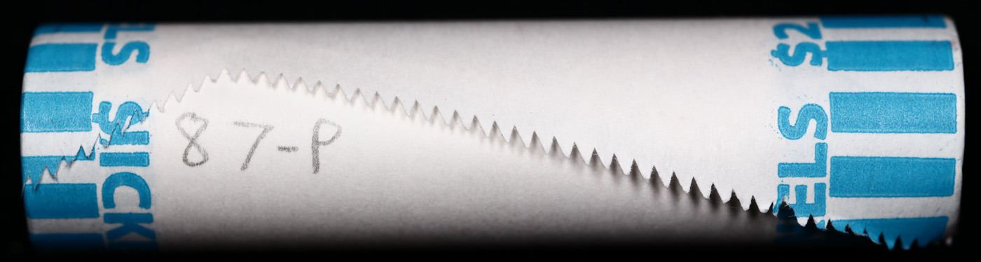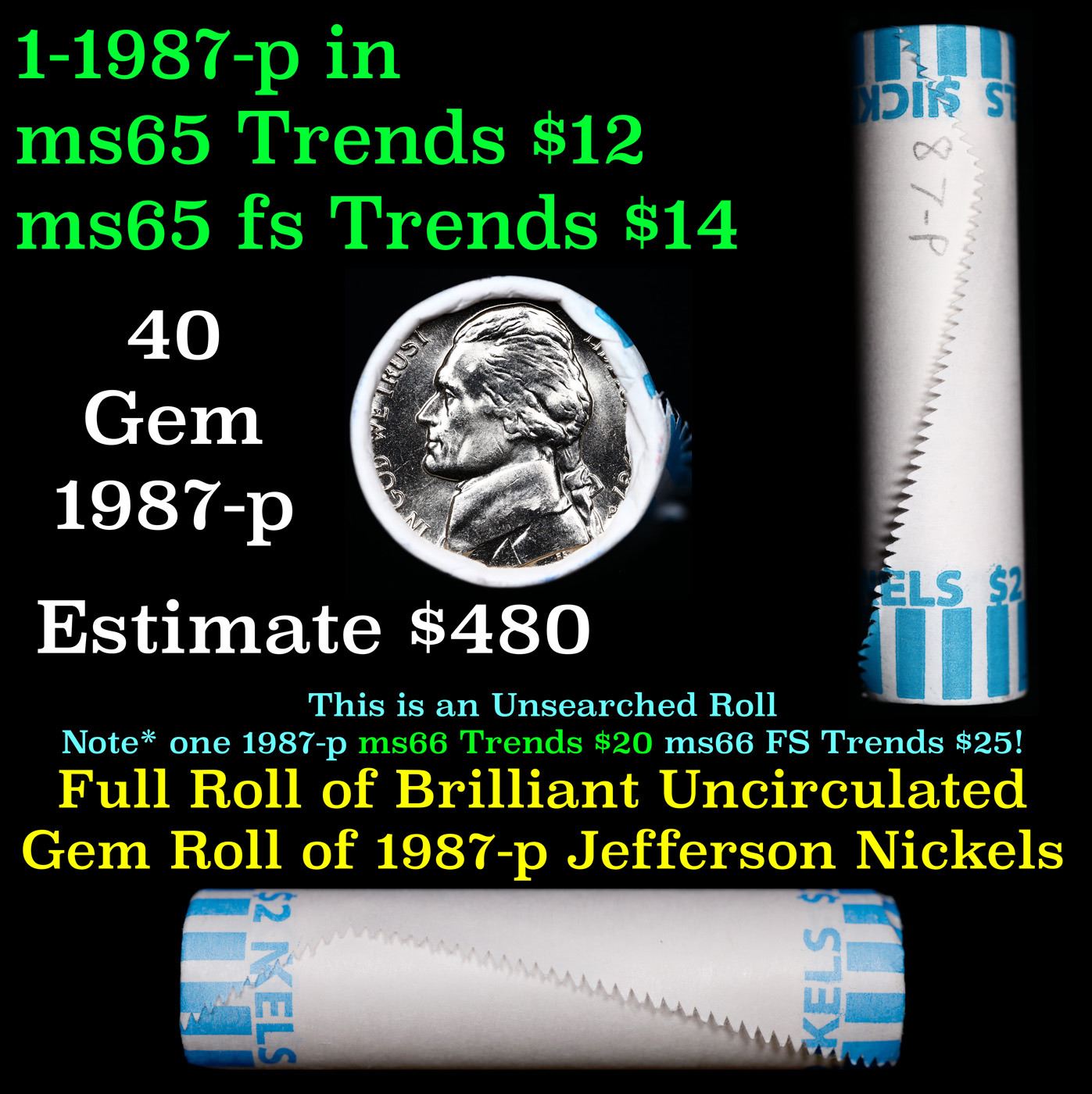 Shotgun Jefferson 5c roll, 1987-p 40 pcs Bank Wrapper. A terrific Shotgun roll of unsearched Jefferson nickles. Most if not all coins should be gem or better