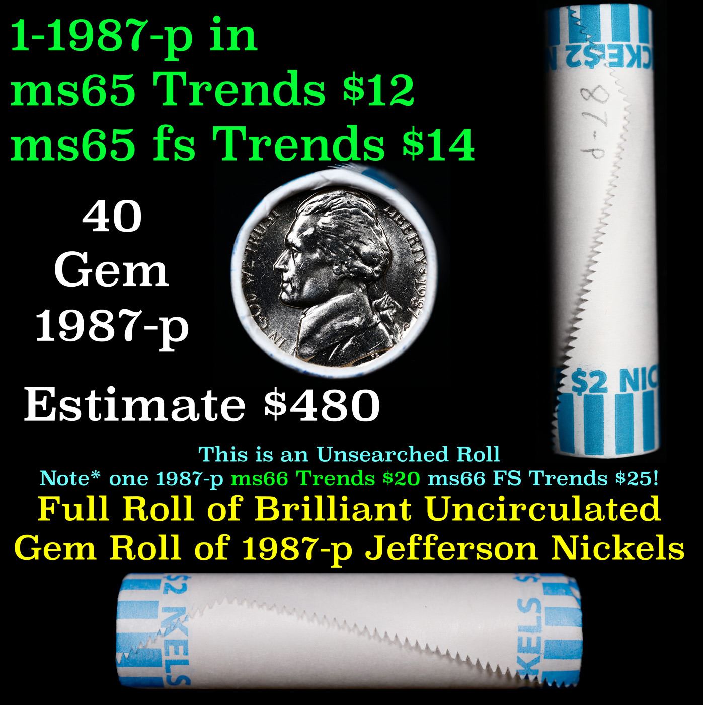 Shotgun Jefferson 5c roll, 1987-p 40 pcs Bank Wrapper. A terrific Shotgun roll of unsearched Jefferson nickles. Most if not all coins should be gem or better