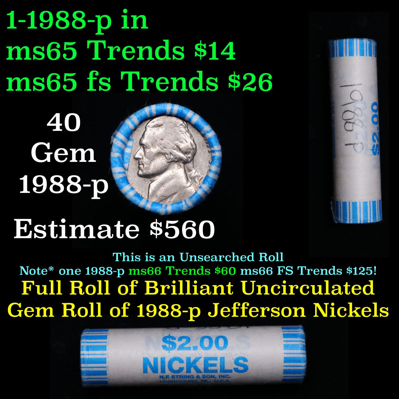 Shotgun Jefferson 5c roll, 1988-p 40 pcs String & Son Wrapper. A terrific Shotgun roll of unsearched Jefferson nickles. Most if not all coins should be gem or better