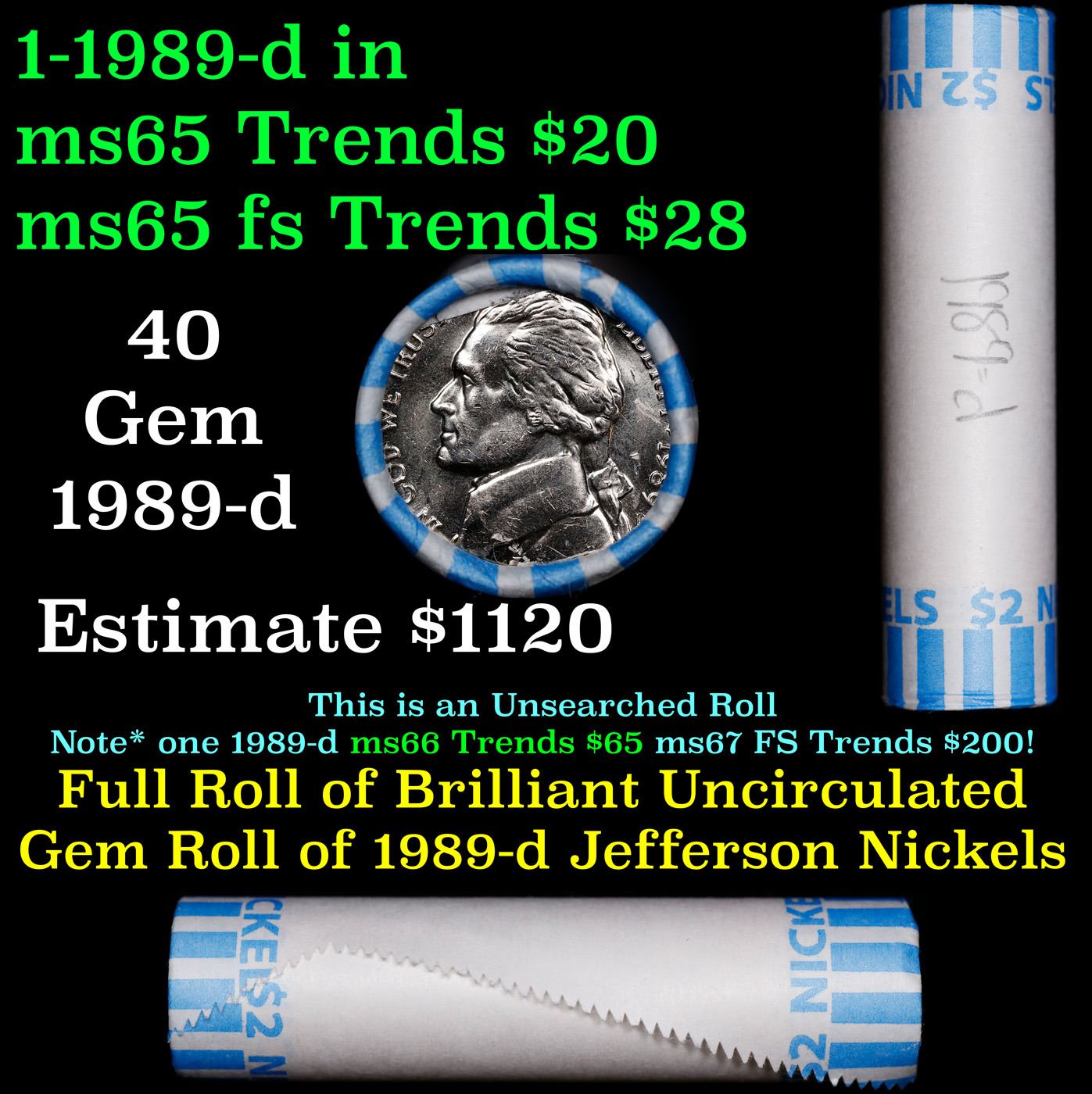 Shotgun Jefferson 5c roll, 1989-d 40 pcs Bank Wrapper. A terrific Shotgun roll of unsearched Jefferson nickles. Most if not all coins should be gem or better
