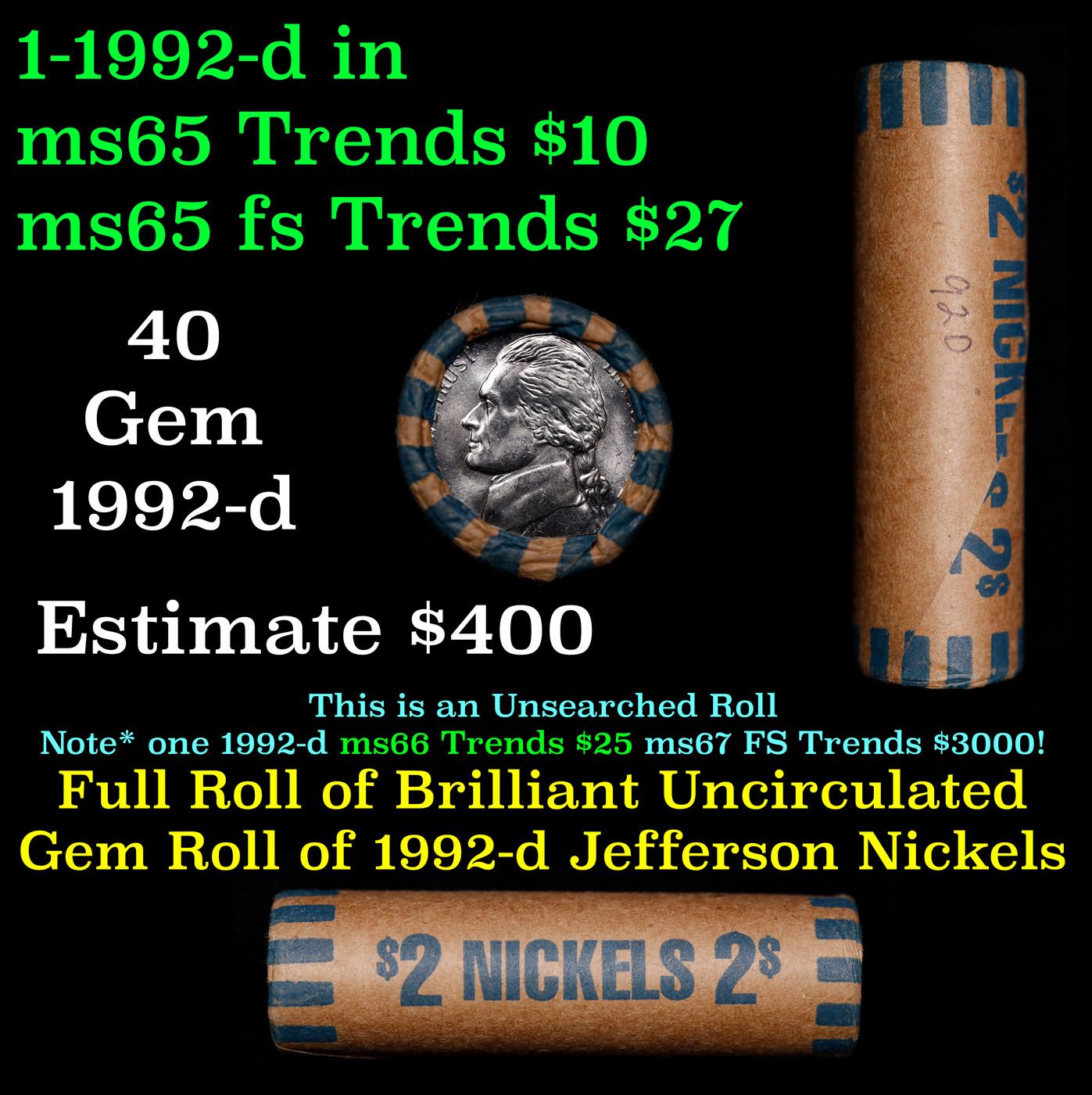 Shotgun Jefferson 5c roll, 1992-d 40 pcs Vintage Bank Wrapper. A terrific Shotgun roll of unsearched Jefferson nickles. Most if not all coins should be gem or better