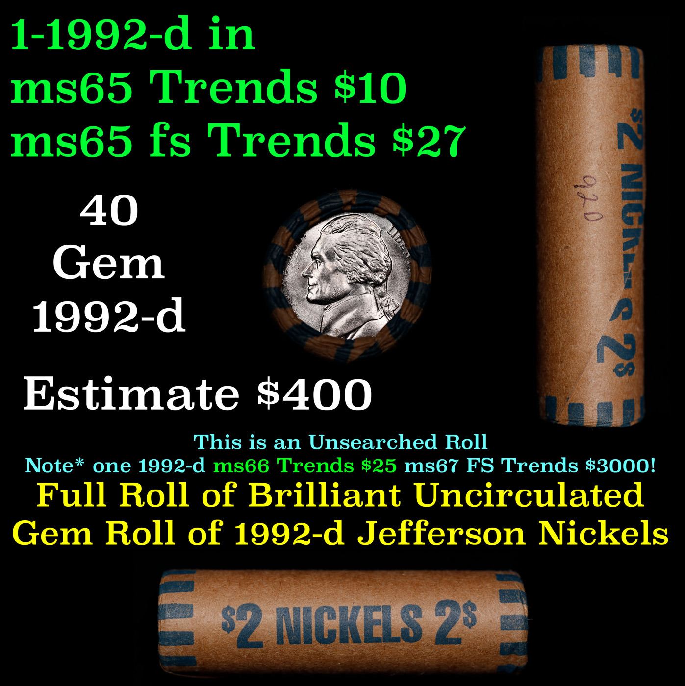 Shotgun Jefferson 5c roll, 1992-d 40 pcs Vintage Wrapper. A terrific Shotgun roll of unsearched Jefferson nickles. Most if not all coins should be gem or better